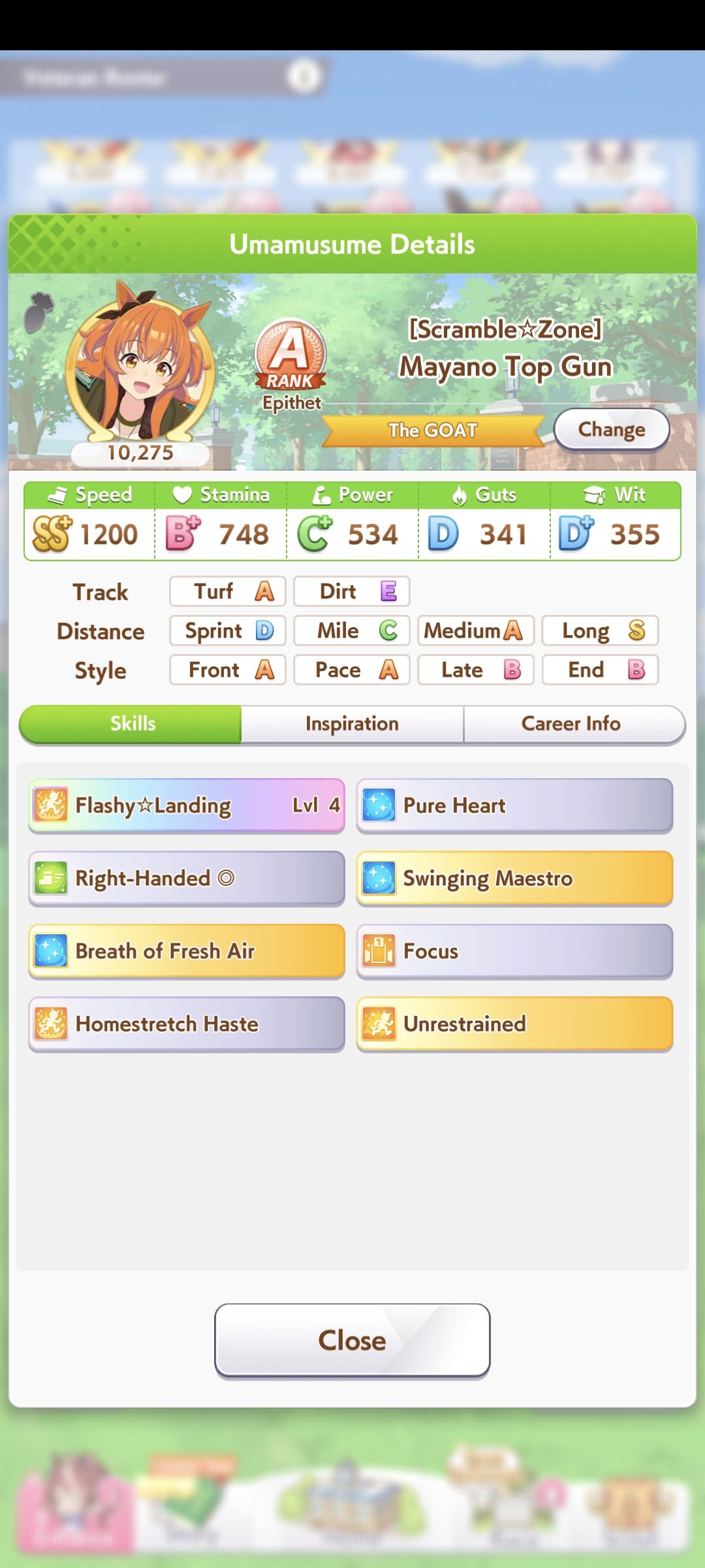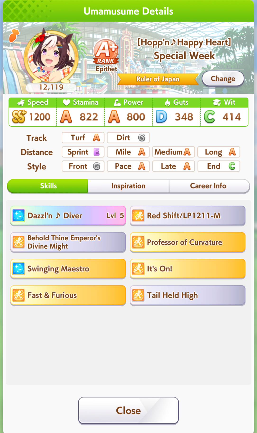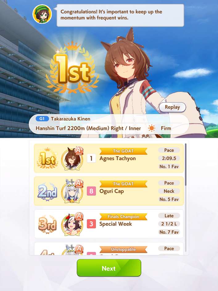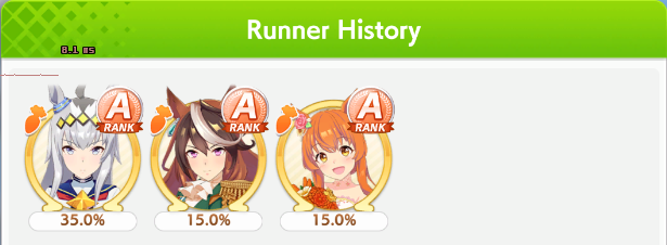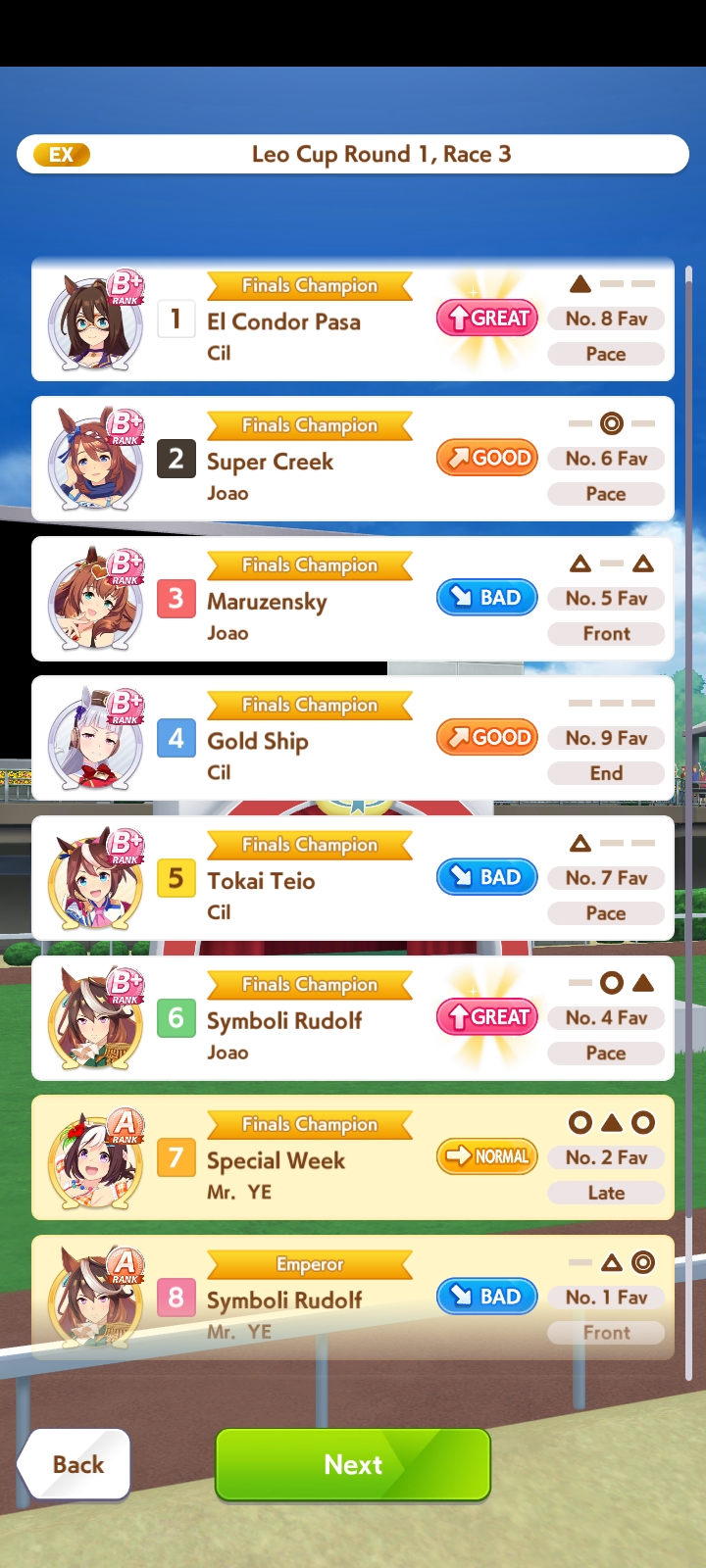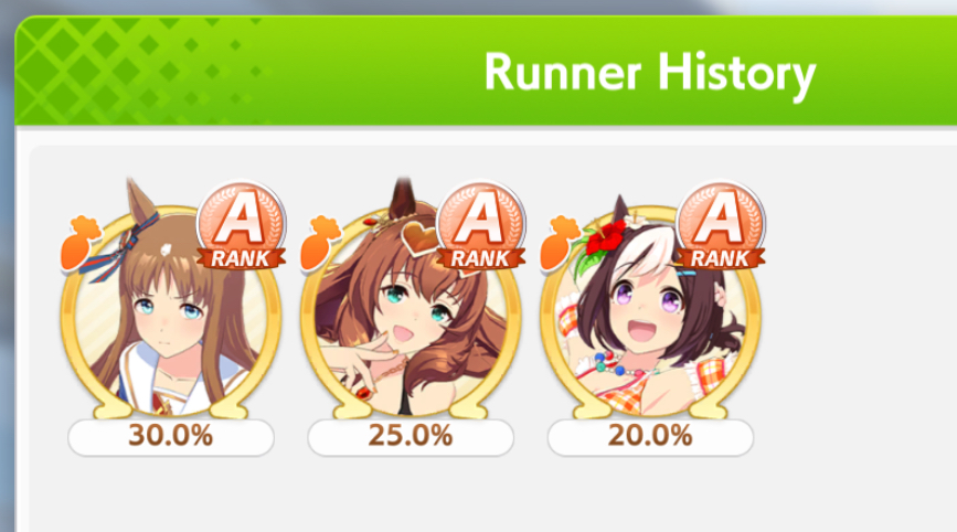 Went 14-6 today. 3 losses were from Golshi. A loss from Teio and Vodka. Can't even get mad.Didn't see that many Front, all S.Maru jobs since they only put her as a sole Front, and other trainers are too lazy to train Fronts.Somehow every race give me Rushed/Late Start, and there is a race with 2 Rushed AND 2 Late Start (still win though).Overall I'm happy everyone can win just like what I want.