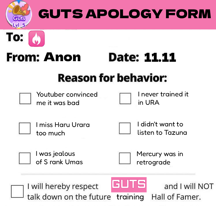 >Increased runners' last spurt speed based on their Guts parameter.Is this THE Guts buff? Are we supposed to go full Gutsmax on the 11th?
