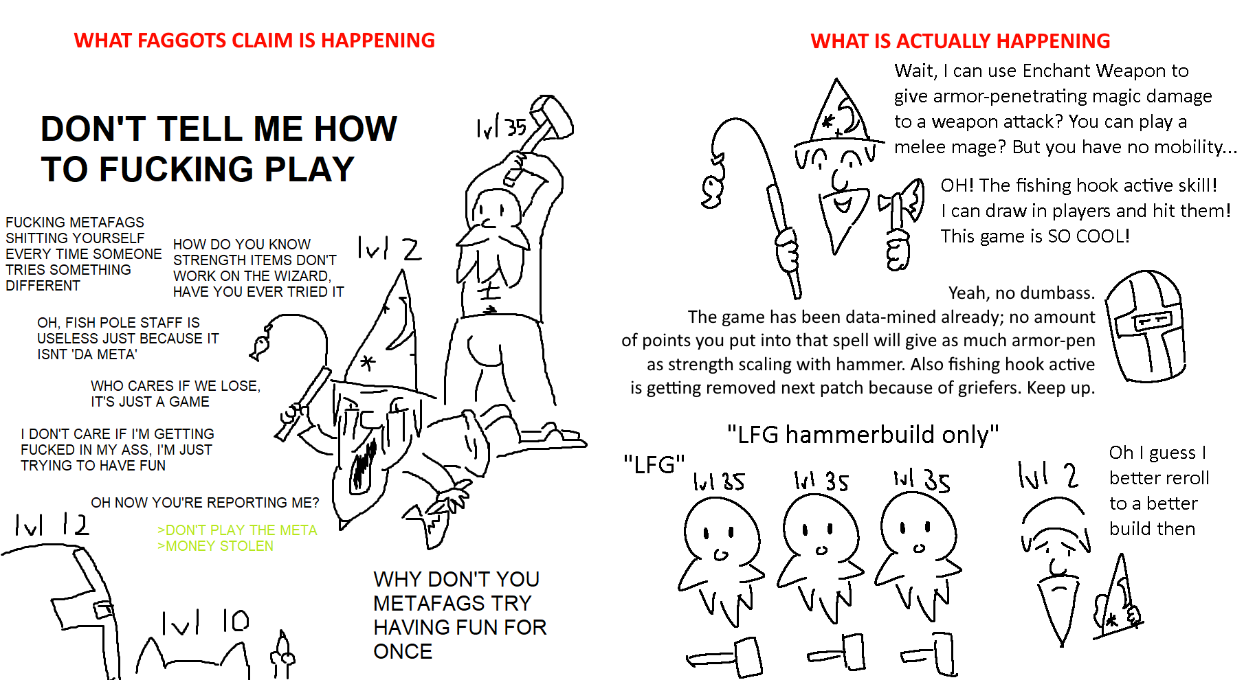 is there a mspaint version of >pve at level 1: fighting zombies and spiders >pve at 20: fighting paladins and pirates>pve at 40: fighting dragons and liches>pve at 60: fighting giant two headed dogs that are also on fire >pve at tier 1: fighting hordes of elementals and a giant tornado of flame with a face and hammer bigger than any one party memberetc etc, and the pvp version is just the same two dipshits smacking eachother with progressively bigger penises on their shoulders