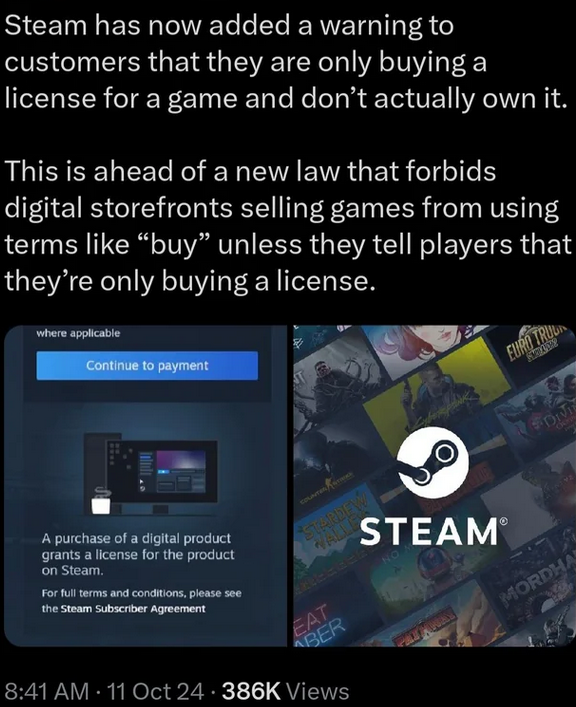 >>725257096Technically you are breaking copyright law if you download a game that has been revoked by a studio that says no more selling on steam but steam lets you download it. All steam does is enter into a contract with a developer that allows them to use the steam to sell their game for a 30% cut. But its not buying its licensing from that developer. The developer has actually all the control still of the game, steam as a company has NOTHING but a contract for 30% that can be cancelled at any time by the devs..Its up to the developers to make steam legally remove the copyrighted infringed games from people's library the players that bought it. But most devs don't do that because they KNOW its morally wrong to remove a product people BOUGHT yet legally its still a license thats like renting.They can do it if they wanted to and steam legally would have to refund people's money because there would be a shit ton of lawsuits and angry people.Its funny how absurd copyright law is, they can't make up their mind morally and legally if someone owns something or not when you BUY IT with YOUR OWN HARD EARNED MONEY. Despite ALL of human history agreeing if someone gives you something permanently in exchange for money, YOU OWN IT. Copyright is mental illness, and it is not theft under US law.It only exists in a gray zone to sell things permanently as a renting service and scam people, Its not morally right.