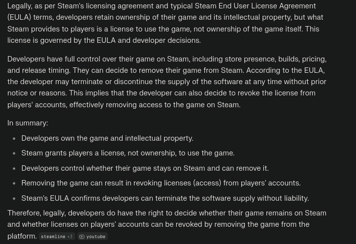 >>725258189NopeLegally as per steams EULA licensing agreement the developers have the full right to the license and decide whether it stays on steam and whether it should be removed from players accounts. They have that full legal right.They don't do this because its morally wrong and usually because its in their interest to keep selling on steam because it makes them money. This is why people hate america.Because corpos and greedy people want control over copyrighted works, yet they know themselves it's not right and enforceable anyways.