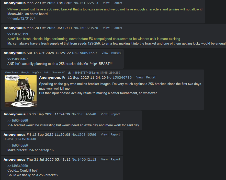 It's funny how people are getting upset people are caring about and praising what /mlp/ does yet we're bound to whatever dumb shit /co/ wants to do, even down to seeding vs brackets.