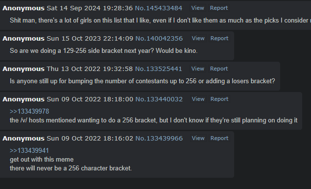 I don't want 256. We get enough filler bullshit from 128-256 as is. If your character isn't good enough to get the bare minimum votes then I don't know what to say