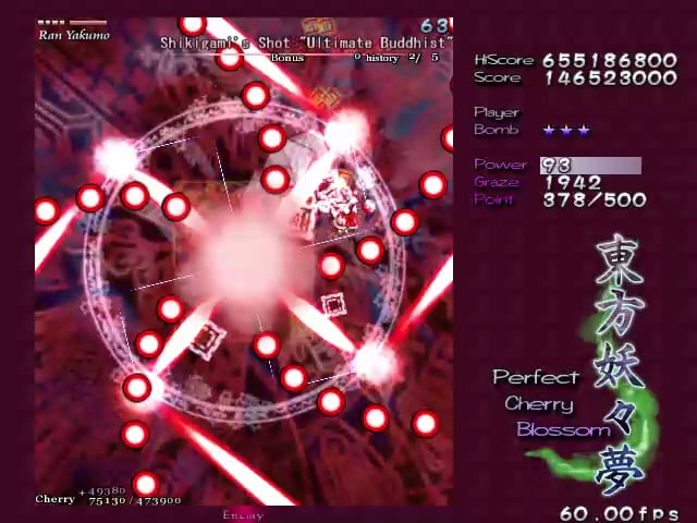 >>725427561It's easier than EoSD because of a visible hitbox, slower bullets overall, and cherry border which is a temporary free bomb/cheat death.As the other anon said, Stages 4, 5, and 6 are a tough spike in difficulty, but if you know how to time the cherry border correctly you can make the boss fights of those stages trivial, especially Yuyuko's.Same goes for the Extra stage. Ran is a little bit tougher than Yukari, because Yukari's spellcards are variations of Ran's, and although it probably wasn't intentional on ZUN's end, they happen to be much easier to do.