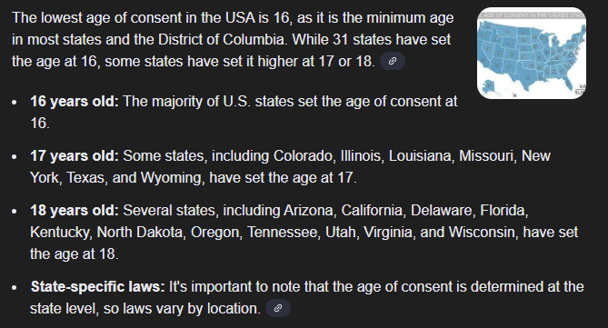 >>725529019Age of consent is most of america is 16. It's literally just mentally ill californian twitterinas who go on holy moral croosades are gaslit entire internet it's 18.