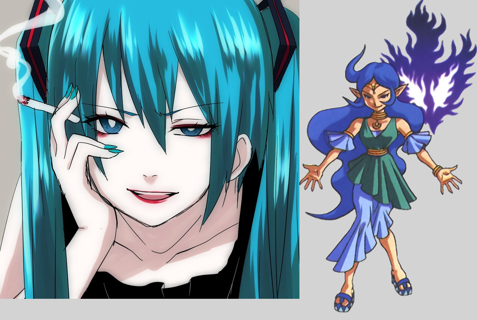 Requesting Nayru possessed by Veran from Legend of Zelda Oracle of Ages smoking a cigarette with a similar expression and makeup Veran put on her.
