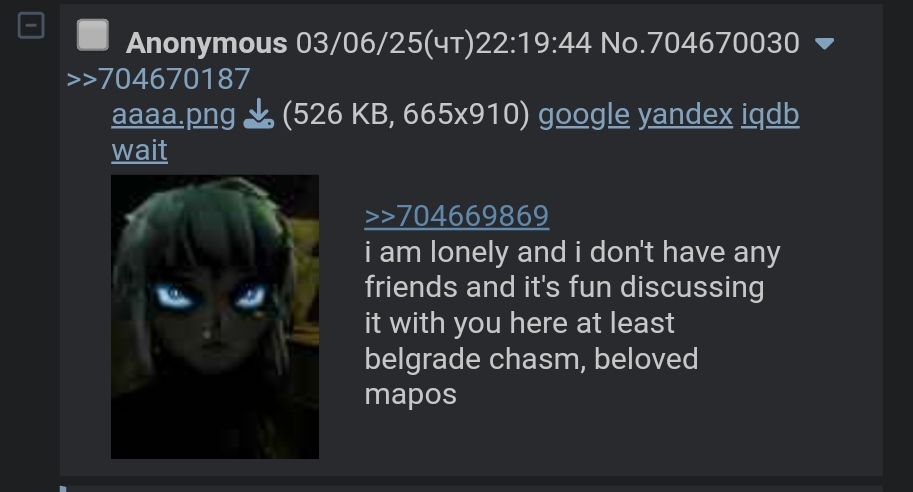 >>725593503>there's a whole pedophile ring in /vrlg/That wouldn't surprise me, nearly every single /trash/ general gives me that vibes besides maybe the snoot one (and even then)>>725593553Thank you for your input, I'd suggest people in your community to steer clear from him in the future. The fact he's started to spamming IT WASN'T ME IT WASN'T ME seems to suggest its the one thing he cares about.