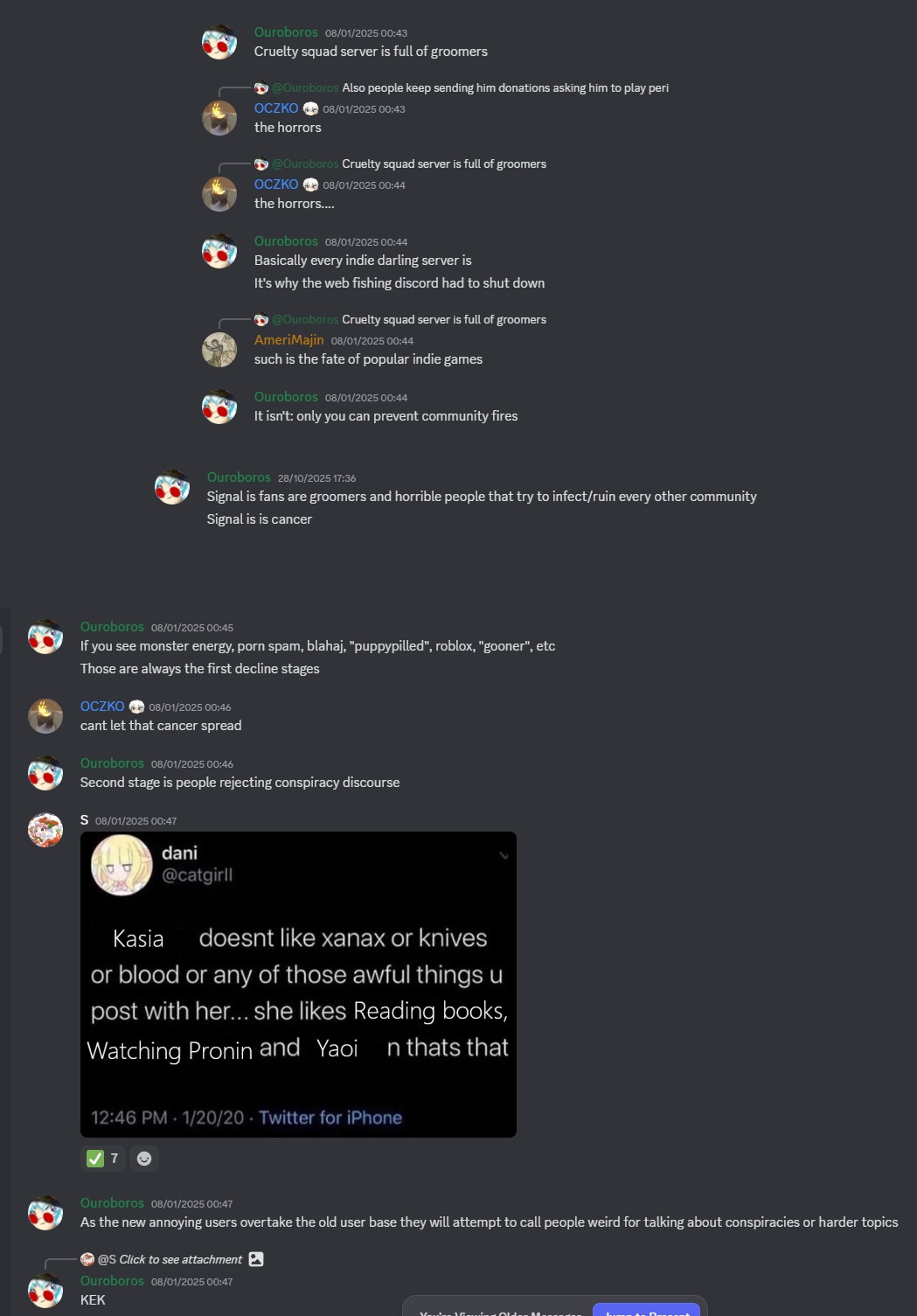 >>725588570A twitterfag named csAlfredo made a shitpost about how the intergalactic war happening in the background of Signalis was cool and ignored by the fans, and the fans seethed so hard over it that IIRC even the devs joined the seething. It should have been a complete nothingburger, yet somehow the admission that literally anything happened in Signalis' universe besides yuri romance made trannies shit themselves for weeks at the horrible thought of faggotry not being in the spotlight for 0.0001% of the time.>>725589574Yes, Genius Eric, I'm sure the discord user with the username you use everywhere else (and whose self-posted screencaps initially had his own name censored) totally wasn't you.