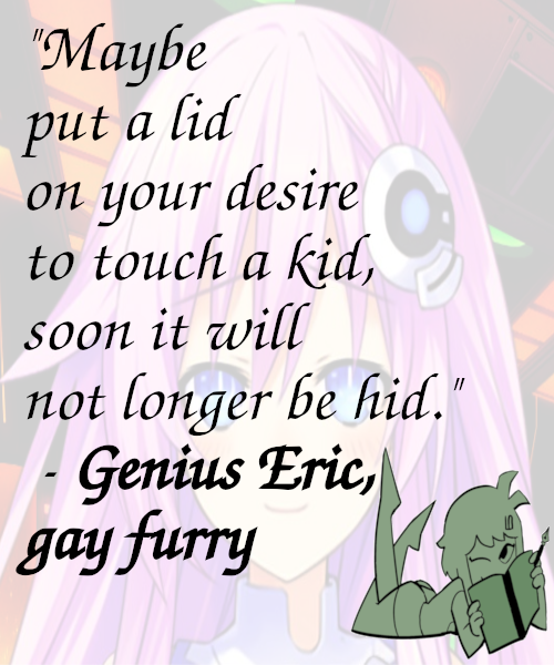 >>725581893>He's my pet cowCareful, he's a furry so that might turn him on.For anyone else, consult https://arch.b4k.dev/v/thread/662050857/#662086806 for Genius Eric doxing himself. I'm tempted to make a compilation screencap of it.