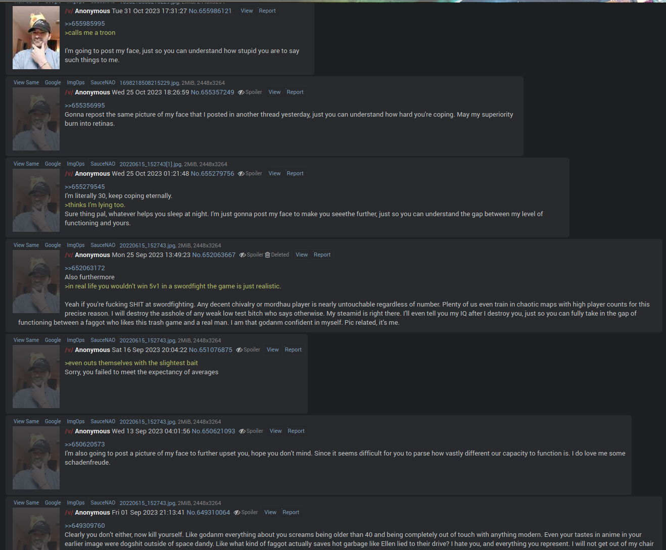 >>725588875This is the same guy who unironically typed this to the dev>I would rape you to death, never attend a gaming convention, I will be at every single one hoping I can find you and murder you for shitting up my eyeballs with your bullshit actionsAnd my personal favourite>My IQ is in the genius rangeWe're dealing with a manchild who was dropped on the head as a kid and has never recovered.