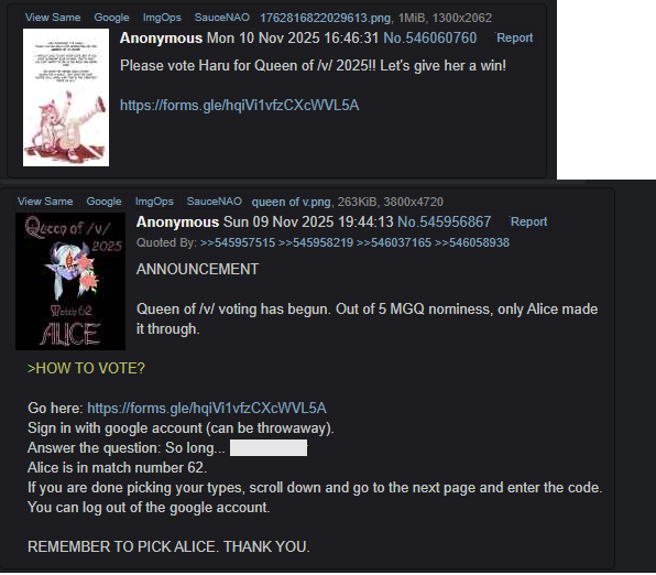 KEEP ALL TOURNAMENT TALK ITT!►►VOTE: https://forms.gle/Wm2ymC4wzHZ4xzB78—Timer: https://www.tickcounter.com/countdown/8625687/the-end-of-round-3►OChttps://4tourney.wikitide.org/wiki/Queen_of_/v/_2025/Galleryhttps://queenkingv.booru.org/►Nominations: https://docs.google.com/spreadsheets/d/1tvrIBrauckDijmRiGG0ceXc4T9NrAwYaJY2szZJBJFQ/edit?usp=sharing►Qualifiers: https://docs.google.com/spreadsheets/d/1hh6Q52hr47R0sY68xplYc4PVJ7z4mb2y2nI9-VuuIJw/edit?usp=sharing►Round 1: https://docs.google.com/forms/d/e/1FAIpQLSekPWFtF3VoX9ZxkL2PXnng-0uOaD8QsmEtqigt36vAUeyTFQ/viewanalytics►Round 2: https://docs.google.com/forms/d/e/1FAIpQLScrgGUzqi3SccKq01VWrKW4vLcjn2PeiLHGiqfRWw41FL5wyg/viewanalytics►Bracket: https://challonge.com/queenv2025►Detailed Rules and Info:https://pastebin.com/2jqMy7Y2►JudgesYotsuba/v/-tanTre/vr/Samus Aran►Hosts>Ballsanon !!5W3bz/1qam6>Coayynon !!h9S8LHq02ZJ>Samaritanon !!vt0xZn2AIz2►Nominations: >>725231564►Qualifiers: >>725333751►Round 1: >>725411784►Round 2: >>725500202►Round 3: >>725594990►Previous: >>725602268