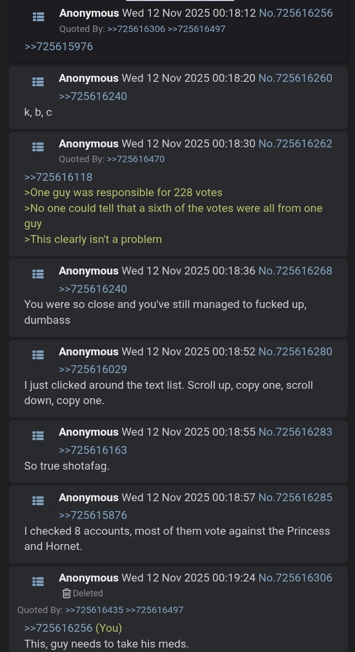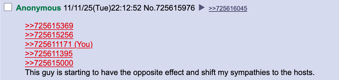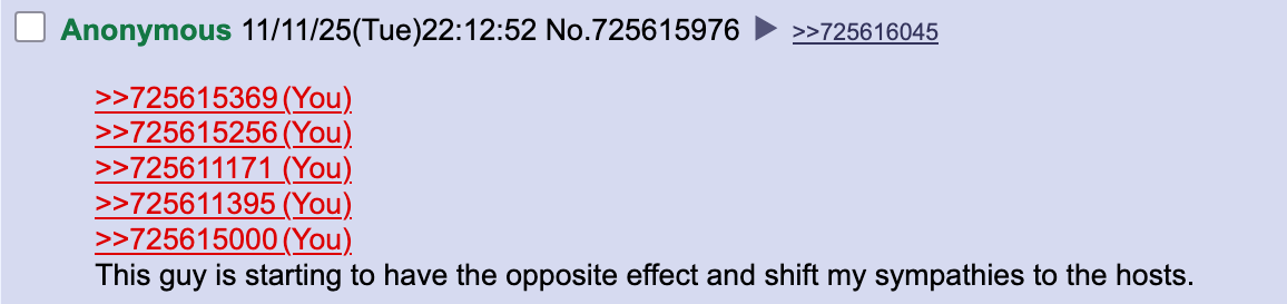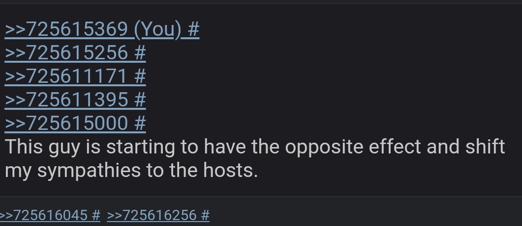 >>725610551The hosts don't care, they'll continue to do nothing. They didn't even respond once during the argument in the thread. They just keep being silent about this whole situation.