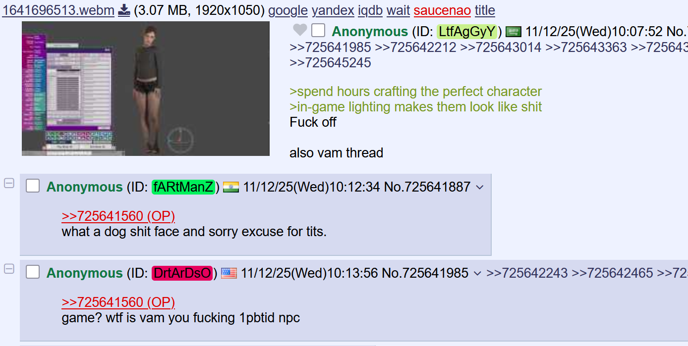 >spend hours crafting the perfect character>in-game lighting makes them look like shitFuck offalso vam thread