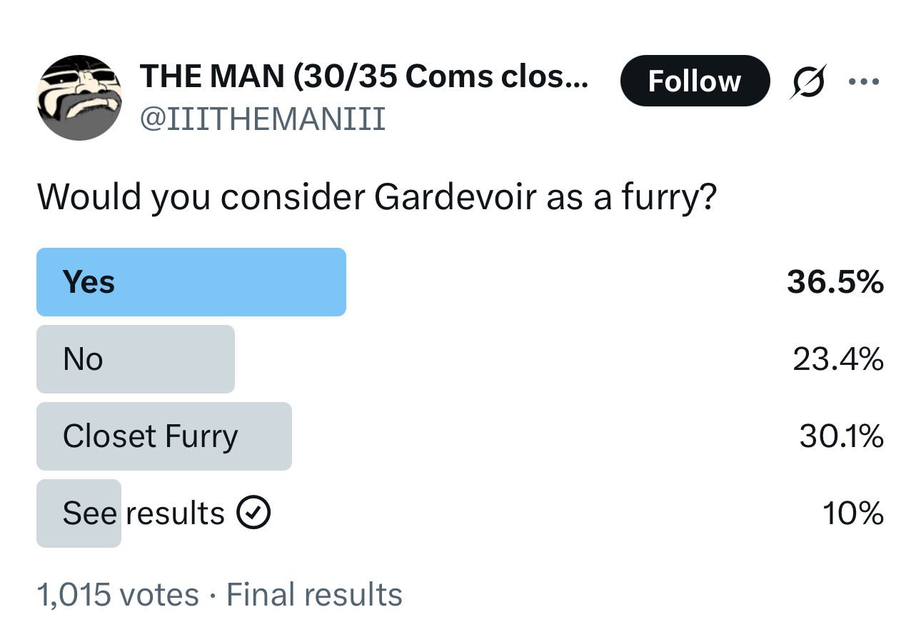 >>725704238It doesn’t matter. People see Pokemon as animals so it doesn’t have to be based off a real world animal. Same with mythical creatures. People consider things like aeromorphs as furry and those are literally anthro airplanes unrelated to animals.>>725705042No their appeal is pretty similar. Polls conducted like those that came from that smash or pass craze a few years back show there’s a lot of people who like both.>>725705706It’s the same on 4chan. Pokemon is furry material here and porn gets moved to trash. People have been banned for posting Gardevoir on /d/ before.