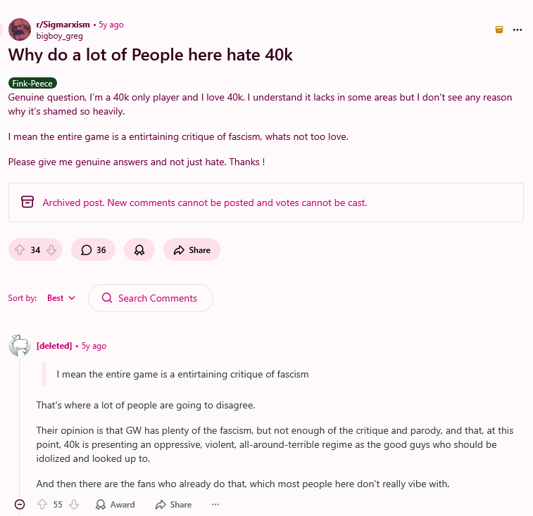 >>725755432>I've seen nothing but praiseSpace king infected 40k with incel chuds who turbo malds over women existing