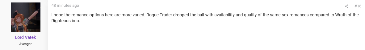 >>725747614I feel like these threads used to be more varied. You had lore discussion, chaos-chan posting, etc. But it was still anchored around the games too. Now it feels like its just bitching about lore or bitching about the state of /tg/ and barely anyone talks about the actual vidya.