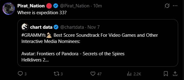 Grammys aren't real awards they're just who can suck up harder to the HFP. Realistically no awards matter and this game already won.(5 million sold, more games in franchise coming)
