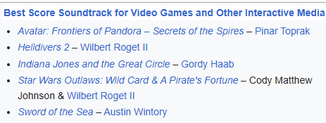 >>725759753This feels like CV padding/gladhanding. Wintory is going to win again, obviously (as he should).But also I think you need to be part of the Recording Academy to even be nominated. That might explain it.