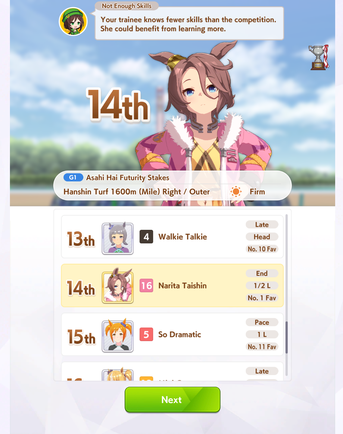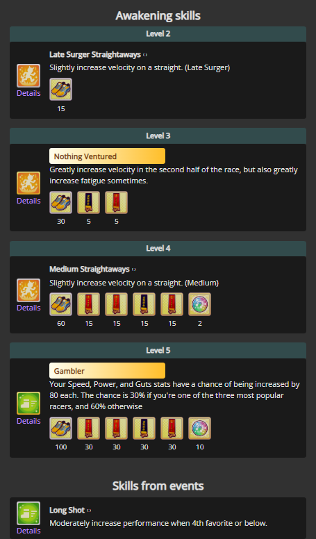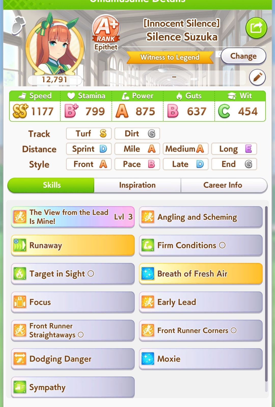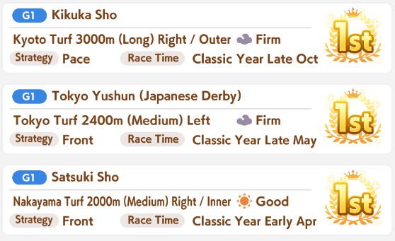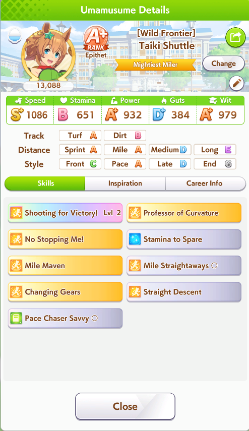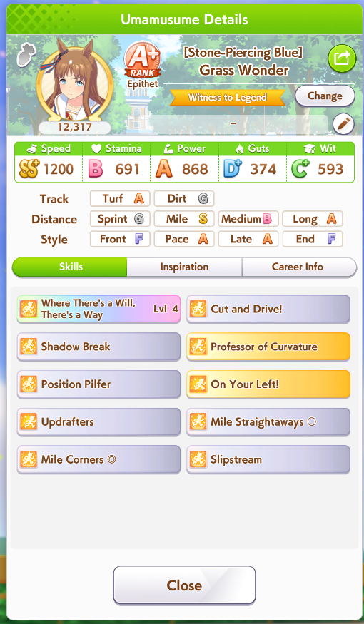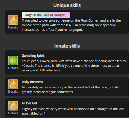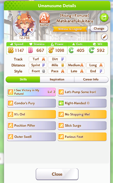 been seeing pacers win more often than lates the last day or so. especially taikilates still getting winsstill not seen a suzuka win. more often than not, the next FR overtakes early and still gets to use Angling, but rarely wins anywayThe winning pacers tend to have high wit, instead of capping power like in CancerI'm building ECP 1200/600/1100/400/850 with Fuji Ult, Speed Star, Head-On for accels, and gambling with Rushing Gale.But Head-On is random to get and FM can refuse Speed Star. I've got all that but w/o mile S so far