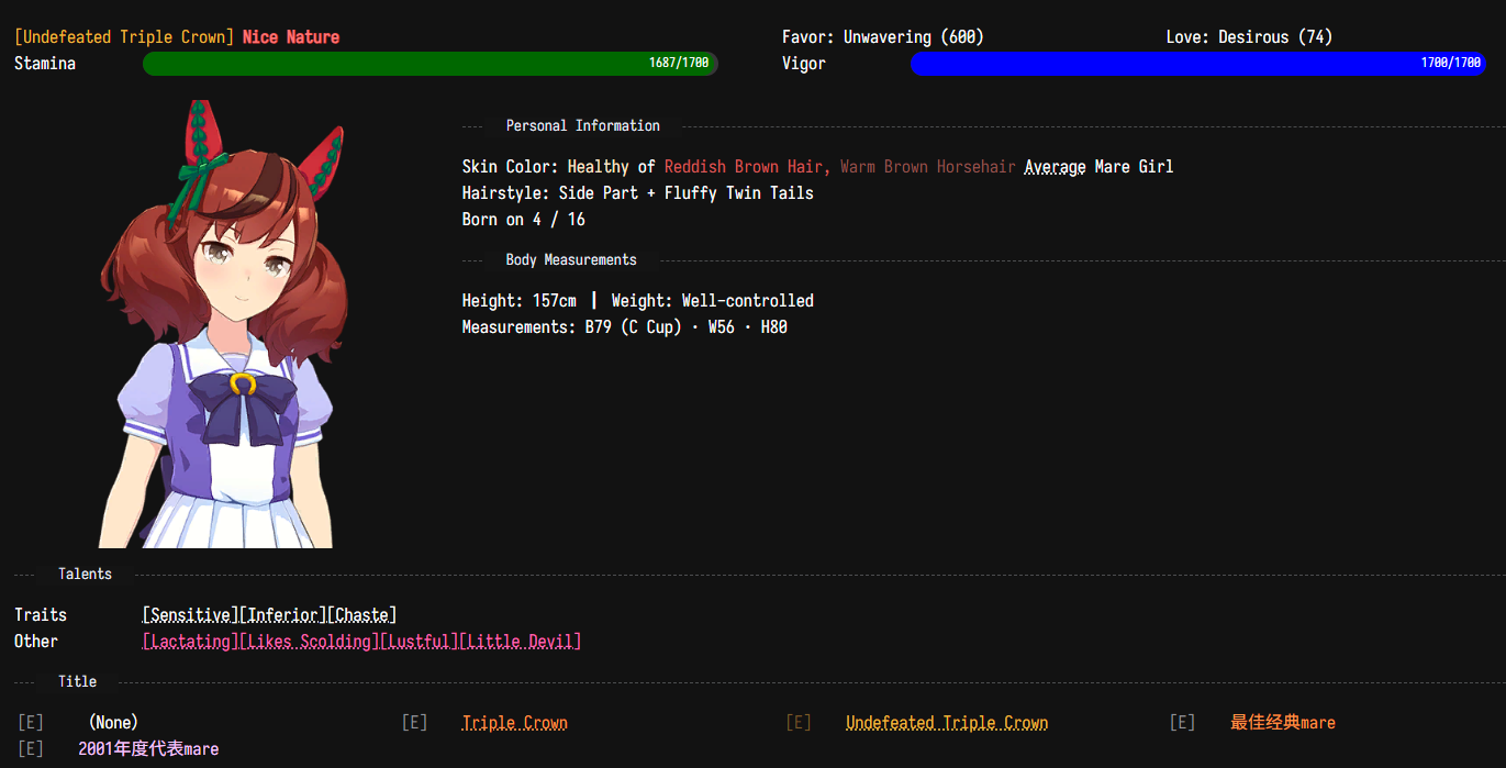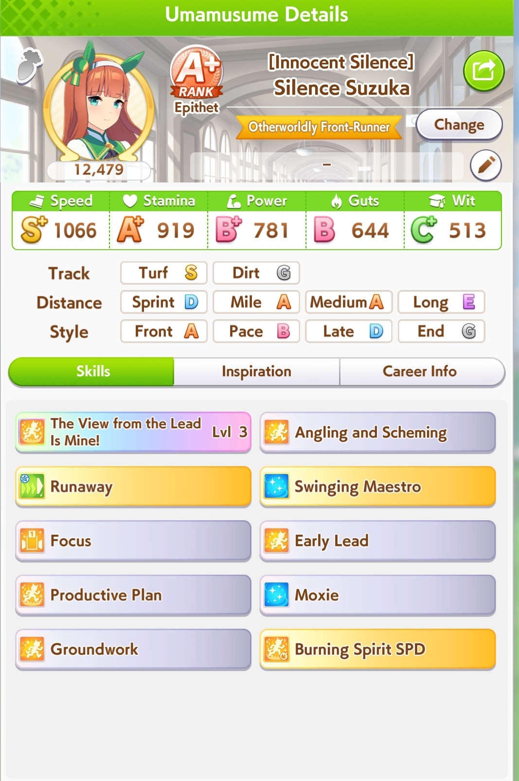 >>725781725That's really cool actually. People need to run her more, she's unironically good anytime people try. Has more use that way than just being some lame ass debuffer. Also noticed that Natie only has +40 speed. Fall runner is the seasonal ability lol. Imagine how good she'd be with max speed+power and even more wit + distance/turf aptitudes