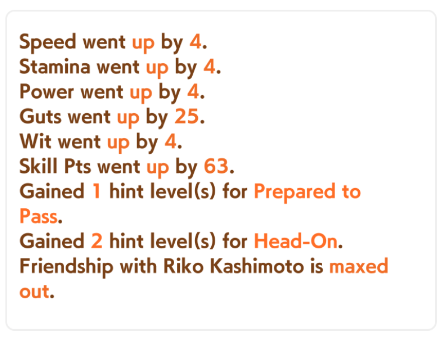 >do 20 unity cup careers>all end in low-mid A>watch the /v/ guide>do two more runs>both end in low A+, beating my previous scenario records for both unity and URA by over 1.5k>both of those runs still could have massive imrpovements, balls almost never landed on speed or powerWhover the anon that made that guide is, may you forever stay safe from the fukutard curses.