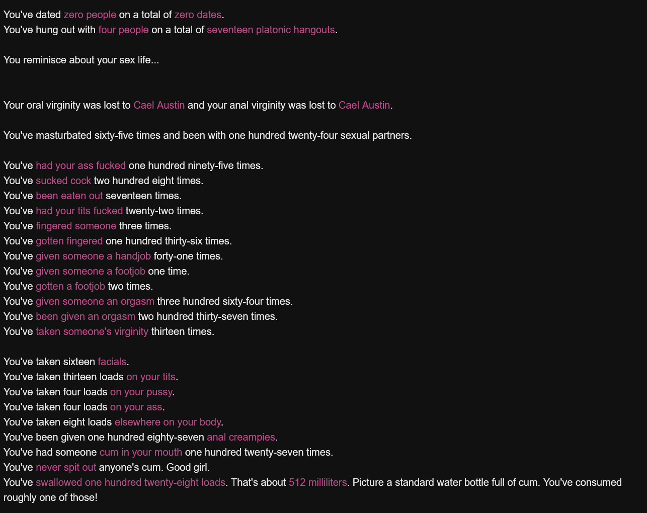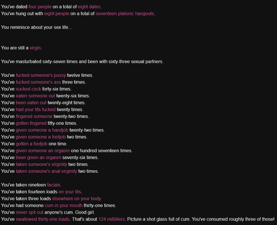 >>725819552it is just words words words, if you can't fap to text you're not going to have a good time. it can be what you want to be, its supposed to be a sandbox, so you can play who you want to play, date, fuck around, etc. updates are regular but not that big. non-con stuff got axed but there is a mod to restore it, there is also a mod to add sprites to npc descriptions and a few more that add content. all mods are only on shitcord unfortunately.
