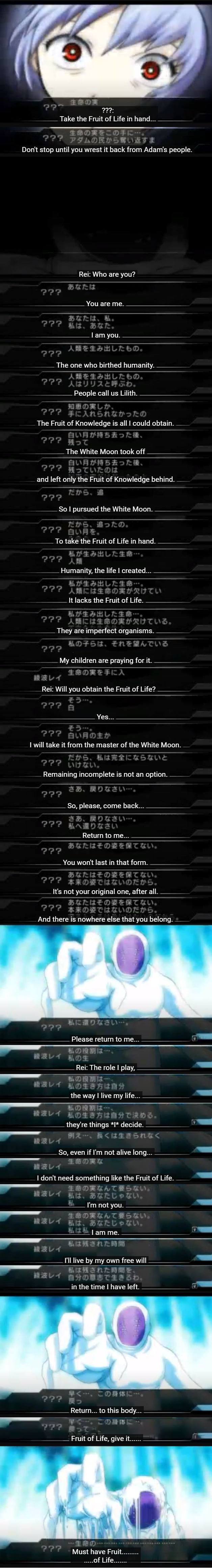 >>726161537All that shit is translated on the Evageeks wiki, and none of it matters to the plot of the series if they never make reference to it, which probably will never happen because now that the remakes are over there's no new content to include the lore in, unless they decide to make a sequel or something.
