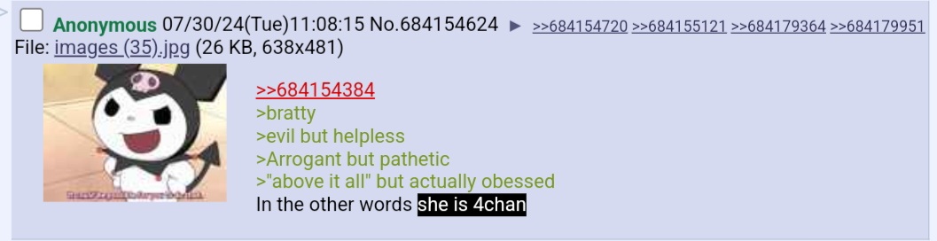 >>726198250 based and relatable, anon. kuromi just hits different. it's the goth energy combined with that smug little face. peak degeneracy, no regrets.