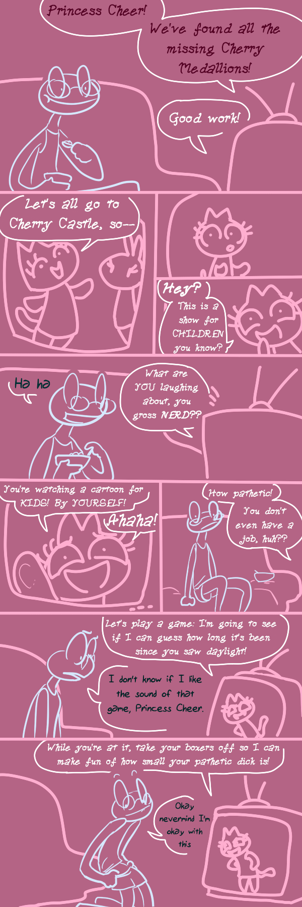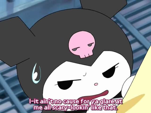 >>726201420it's as real as the 3rd season of my melody having a moment where kuromi and many other "losers" asking all of the otaku or loser-like viewers to give them their energy which results in them all dying.the anime's fun, stupid but fun, also kuromi's a fucking bitch but that's because that pink rabbit is pure fucking evil.