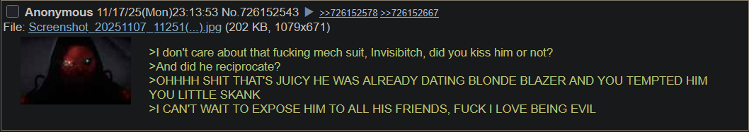 >>726214472You ARE an incel though, especially if you think the Supergirl breaking up with her shitty corporate phony boyfriend who doesn't love her when she realizes she wants to be with you is a BAD thing.You're just a weak little vermin. Instantly imagine yourself as the weakened loser, getting dumped for not making her happy. You instantly paint Robert Robertson into a weak and pathetic image and it's all completely imaginary, nothing about it is supported by the game.