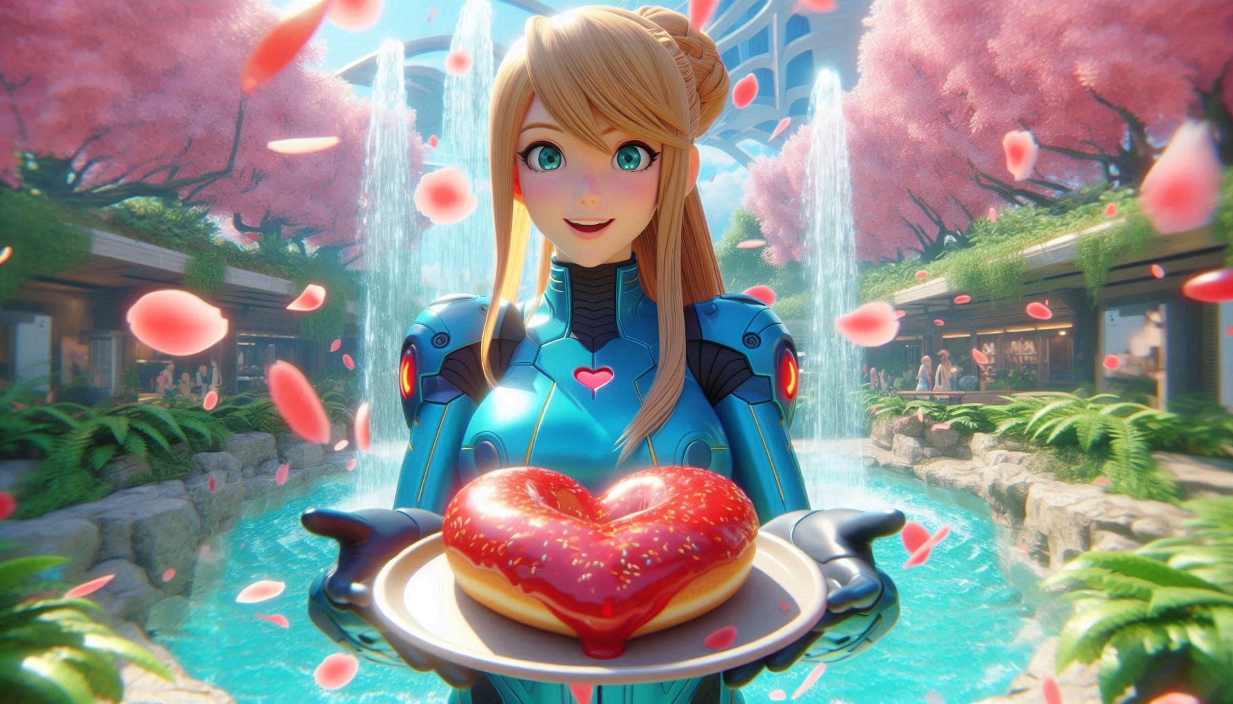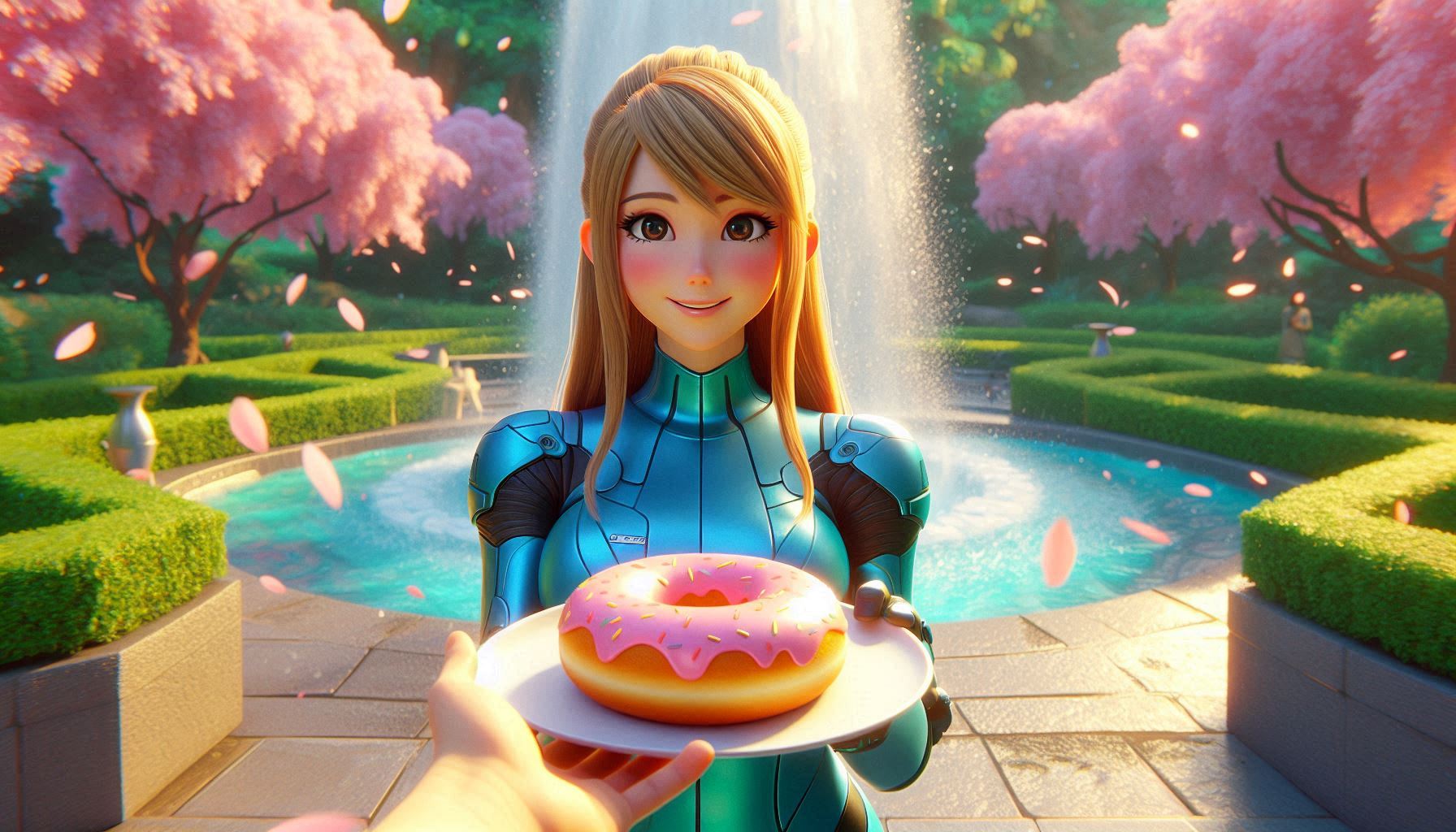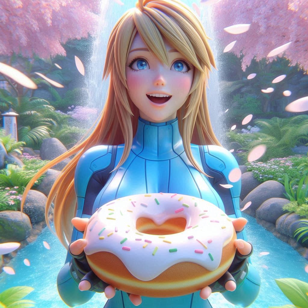 >>726263597Not OP, but since he did use my image:>00's digital anime art, 3D elements in the background. PoV hand holding out a big donut on a platter. portrait of Samus Aran(cyan space overalls, blond long hair) from Metroid in lush garden holding her hand over her solar plexus. Looks expectantly towards the camera, standing in front of water fountain. She has a wide smile like she was in a tootbrush commercial. falling sakura-leafs
