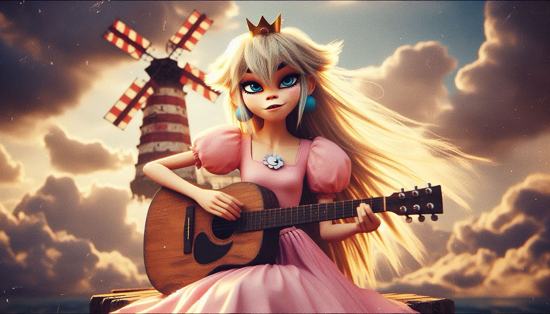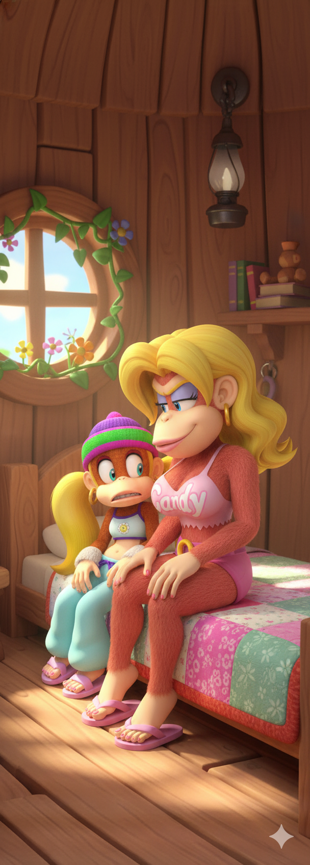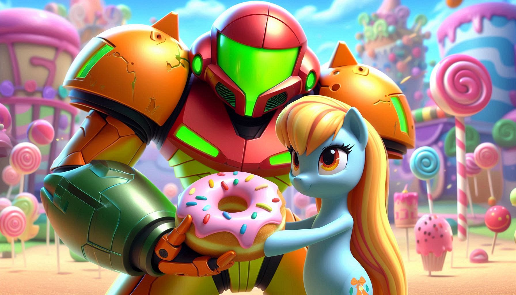 >>726263597Samus from Metroid holding a glazed donut from a pony mare from my little pony with candy land background