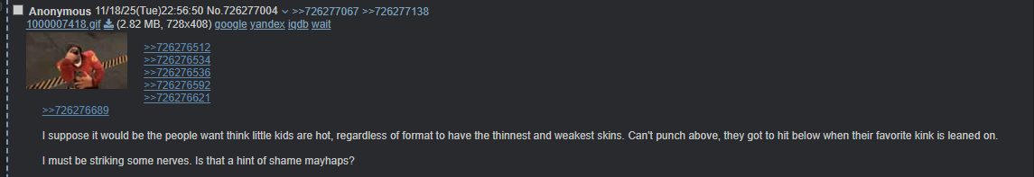 >>726276512>>726276534>>726276536>>726276592>>726276621>>726276689I suppose it would be the people want think little kids are hot, regardless of format to have the thinnest and weakest skins. Can't punch above, they got to hit below when their favorite kink is leaned on. I must be striking some nerves. Is that a hint of shame mayhaps?