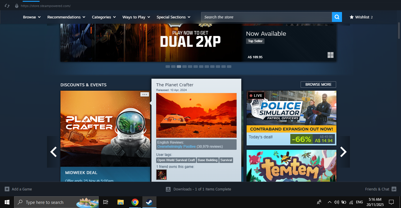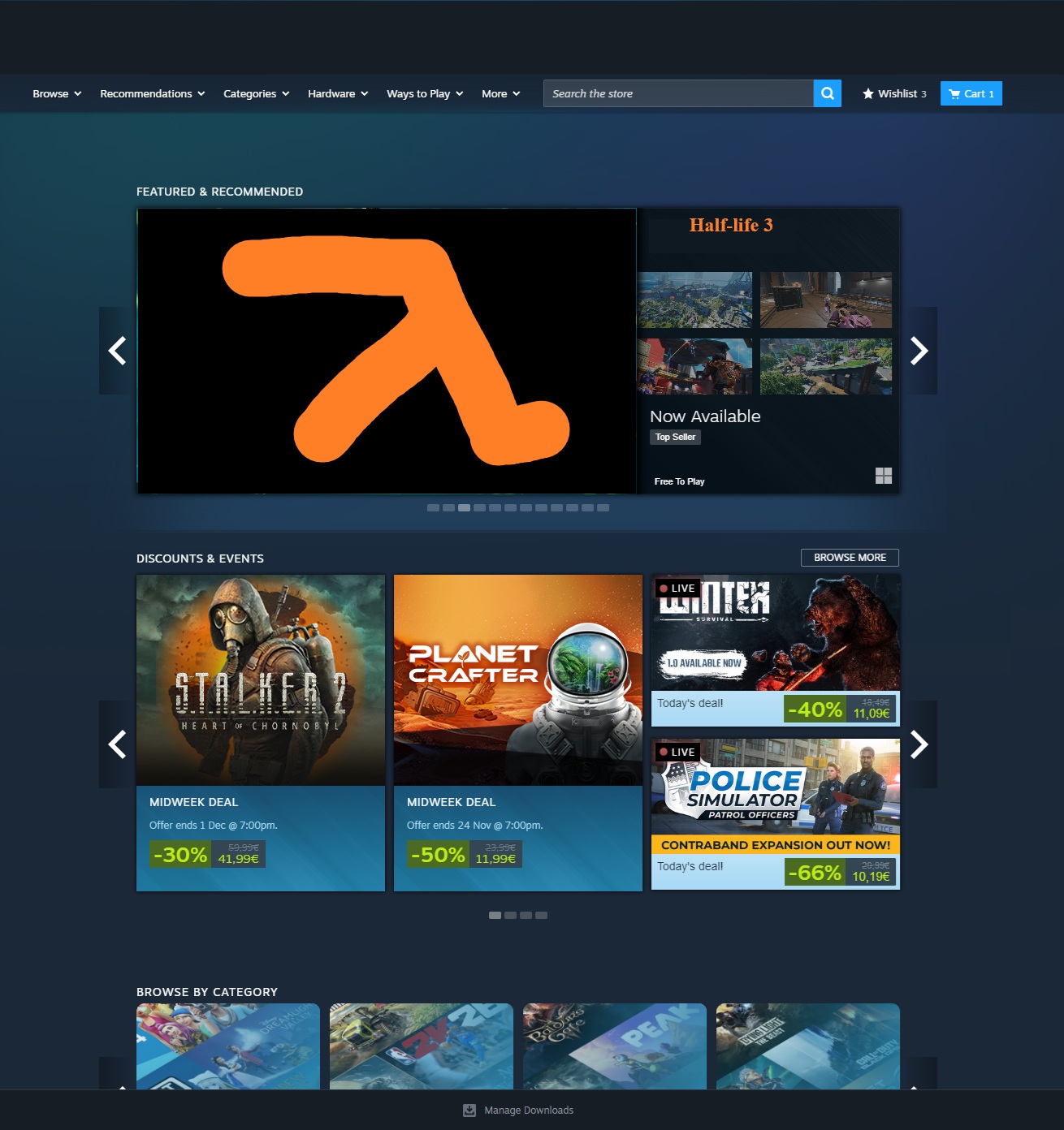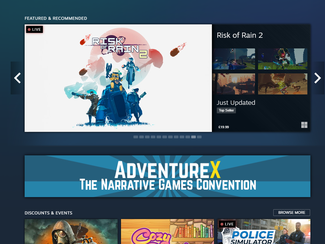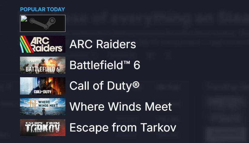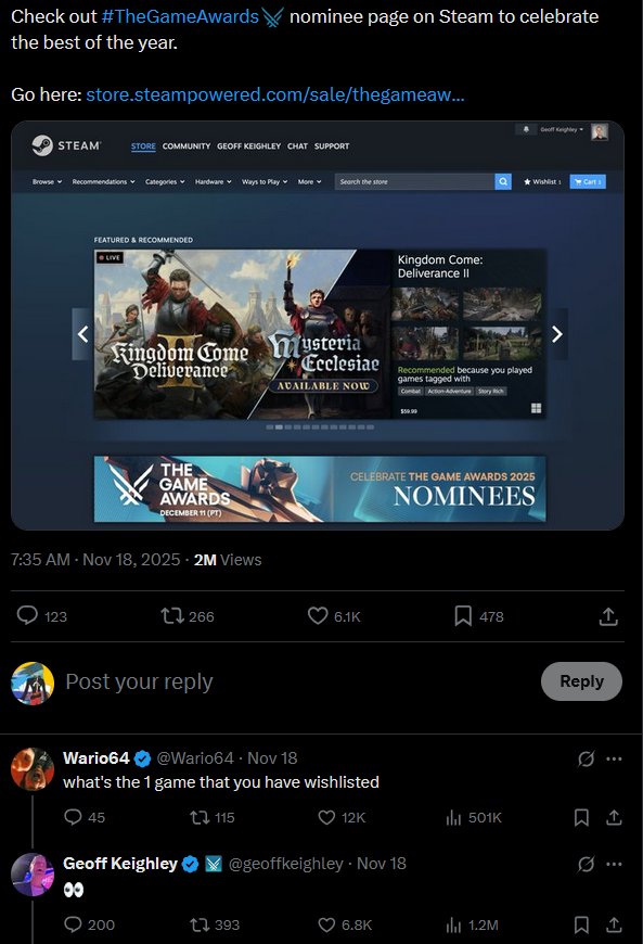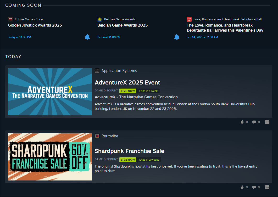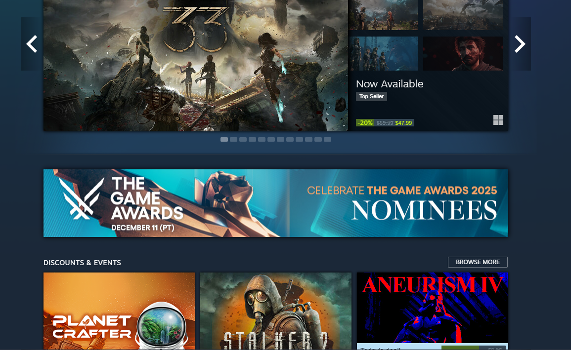 NOV 12 just steam deck + animal salehttps://web.archive.org/web/20251109011247/https://store.steampowered.com/NOV 13 steam deck + animal sale + hardware announcmenthttps://web.archive.org/web/20251113030318/https://store.steampowered.com/NOV 14 black ops top banner + steam hw + deck (animal sale moved to sale box)NOV 15-17 marvel rivals top banner + steam hardware + deck (animal sale sale box)https://web.archive.org/web/20251115000204/https://store.steampowered.com/NOV 18 Where Winds Meet banner + TGA + steam deckNOV 19 No sale banner (first time since the 14th) and ONLY steam deck/no TGA/no salehttps://web.archive.org/web/20251119040304/https://store.steampowered.com/TGA banner was up earlier today but is gone now