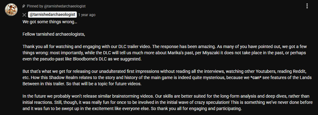>>726335042>Relatively articulate guy with a smooth voice becomes the "lore scholar" of the game with maybe some of the most retconned filled and schizophrenic lore not meant to be solvedI just don't understand the appeal, do normies not know how to read? Most of the stuff is just almost public knowledge from threads or reddit posts
