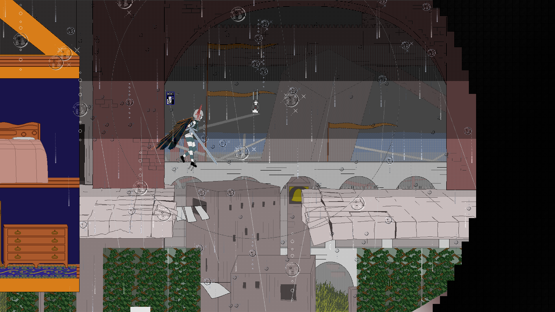 I made a rain effect with droplets that only use every second pixel so they don't obscure gameplay. I would post a webm but it would be too big and the game doesn't look good downscaled, because the universe conspires to make my game unmarketable. Apparently they also dropped fullscreen support in windows 11 so fuck me I guess.