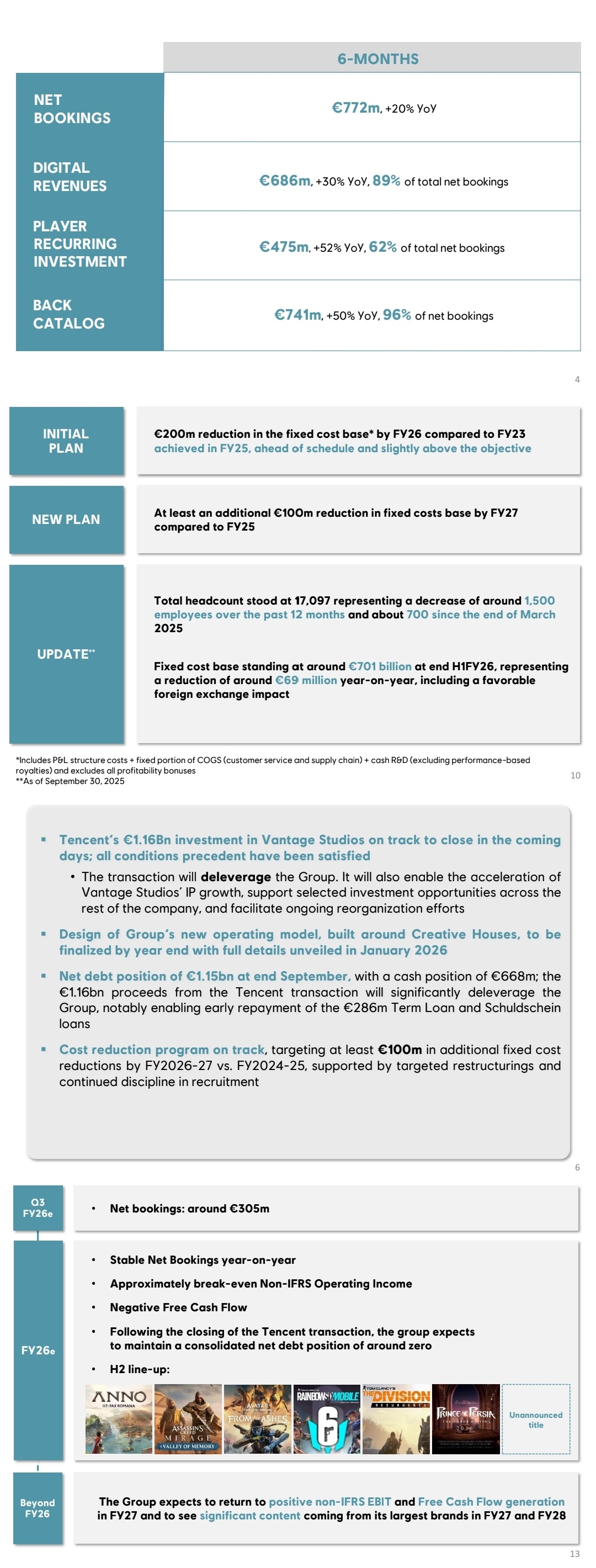 >>726474435Bookings +20.3% in H1 vs sales –2.1% means a larger share of business is being deferred (live services, undelivered content, etc.).Actual recognized revenue dropped by 2.1%. The "growth" in bookings has not yet translated into recognized sales, or it relies on deferred revenue items (season passes/partnerships) that have not yet been delivered.Big improvement in both operating and net margin vs last year, but still loss‑making at the net level.