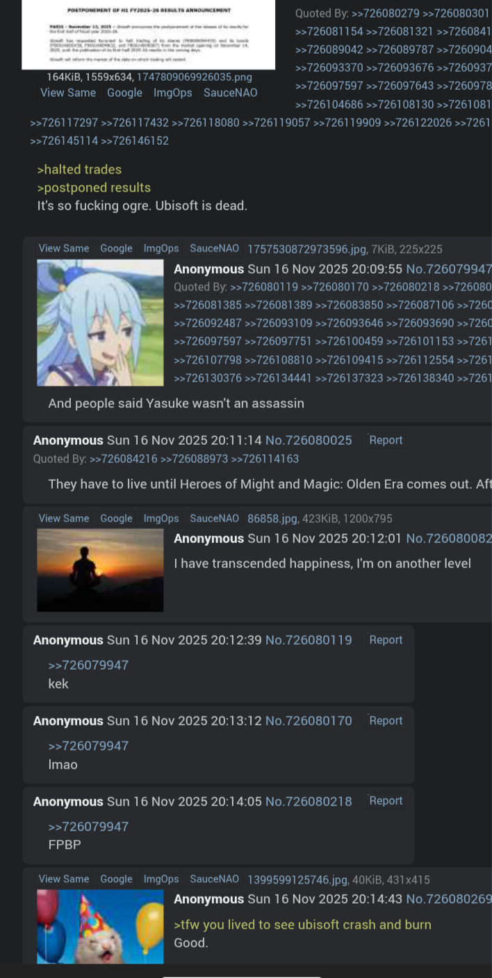 >>726481013>>726481013>But if Shadows had sold anywhere close to 10 million Ubi would have shouted it from the roof tops.No, no they would not. The reason why they are keeping these numbers secret is actually less about the sheer number of copies sold looking bad, and more about them having to admit JUST HOW INEFFICIENT they are. They aren't silent about the numbers because the numbers would look bad - they are silent because admitting that even 10 mil + sales is still not enough to justify the investment would be THE REAL FUCKING KICK IN THE NUTS to their investors.They are not hiding failure of Shadows, they are hiding a fundamental dysfunction of the whole company on every level. Everyone knows that Shadows is one of their most "unpopular" games. Everyone knows that they can't keep making games like this - e.g. that the game "flopped" from their commercial interest point of view.There is no hiding that.What they are hiding is how fucking broken their own spending culture is, how inefficient the company really is, how, despite having tens of millions of fans so loyal they will buy every fucking piece of trash they release: they still fucking can't sustain their own business for future.That is the real shitshow here, that is why the company is tanking, and that is what they obviously didn't want to admit to their investors. Shadows obviously didn't do well enough to save them from the current shitshow. But the sheer scale of the failure is actually far bigger than just Shadows.