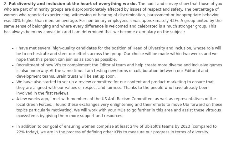 >>726479312There's a difference between the corporation as a "person" and the actual people there making decisions.The legal entity Ubisoft doesn't give a fuck about faggots or racism, they're just trying to find the path to profit.But in practice, their decisions ended up putting activists in charge of making decisions, and that's where decisions that are clearly ideological are made. There's no point in pretending that this doesn't happen. A few years ago, an anon who claimed to have sold all his Ubisoft shares posted a bunch of screenshots in a thread showing how infected Ubisoft was, and how insane it was to invest in the company at that time...Read pic related and tell me if that's the vision of a corporation seeking profits blindly, or the vision of an activist.