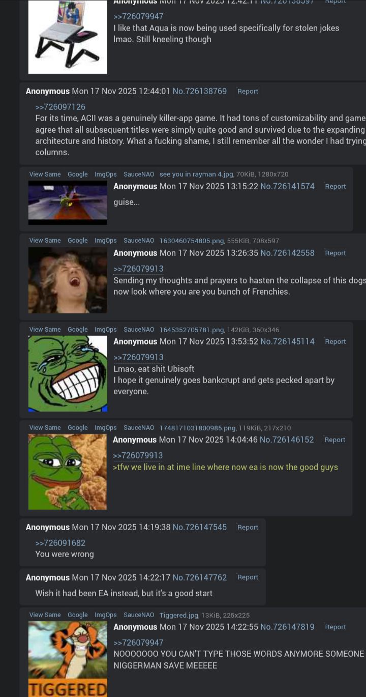 >>726480185>Sure, there are a lot of woke people in Ubi, but I doubt this actually affects how Ubi acts as a company.I see, but the whole problem is that Ubisoft is making cultural products. If it were a hammer manufacturer, no one would give a fuck if they were fighting internally to end racism in the world. At most, they would make some pink hammers or some shit like that, lol, which wouldn't mean anything.But in their field, the internal beliefs of their employees end up severely impacting the content of their products.