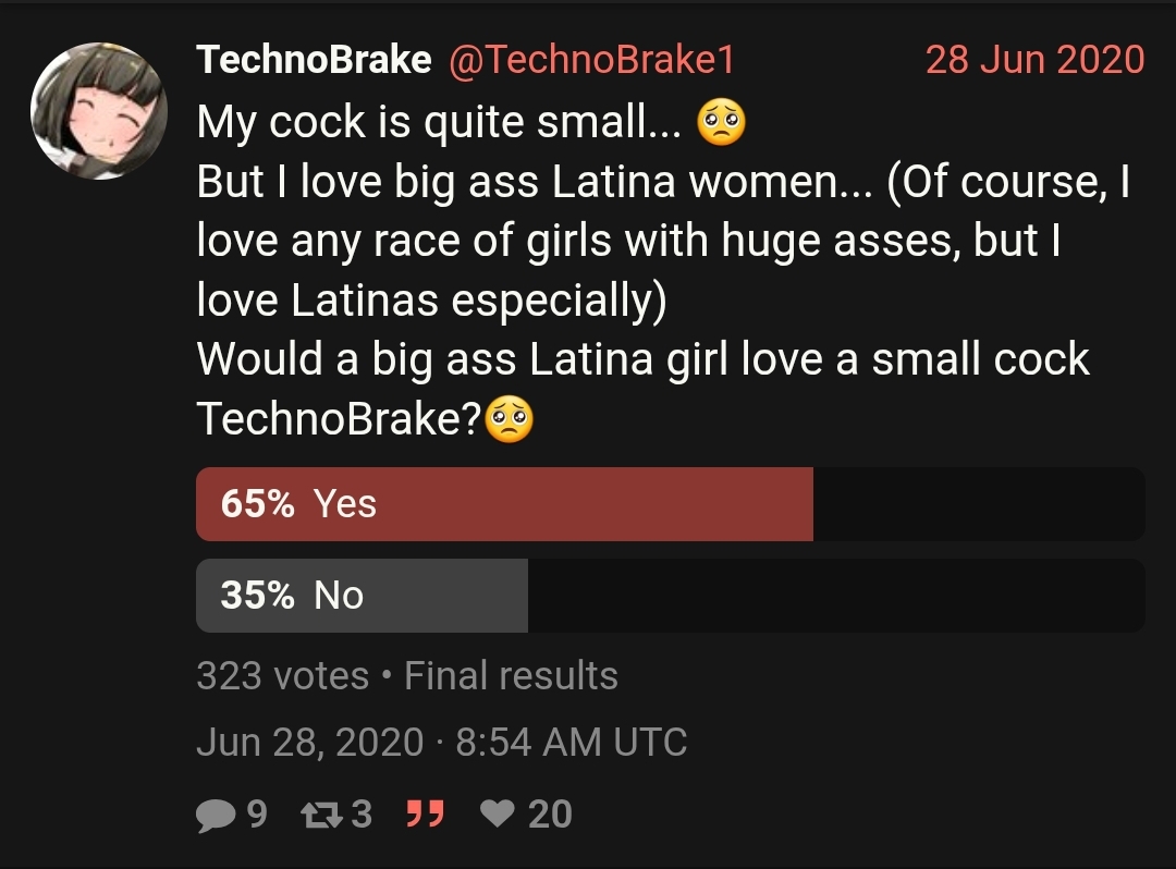 >>726560713What?Tehcnobrake is asian>>726560740netorase doesn't have cheating, the viewer is aware and encouraging of his waifu's sluttiness