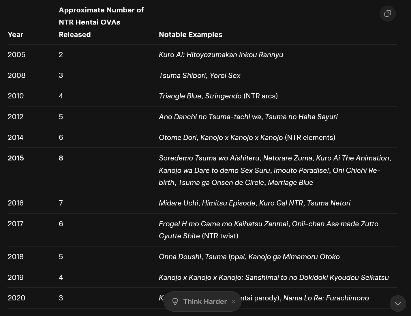 >>726581016>Reverse NTRgood fucking luck finding anything, no one can apparently agree on a category name so shit is all divided between RNTR, Gyaku NTR, reverse NTR/netorare, cuckquean (which is mixed with consensual cuckquean), 3-way etc.I think the best anime scenes I've found are from koitto kinenbi 1 and 2 and Hatsu Inu 1.For games there's really fuck-all. I remember finding some RPGmaker games on f95 but they weren't great. There's a few VN's you might grab if you're a fan of those and ok with autotranslate but they're also not great.
