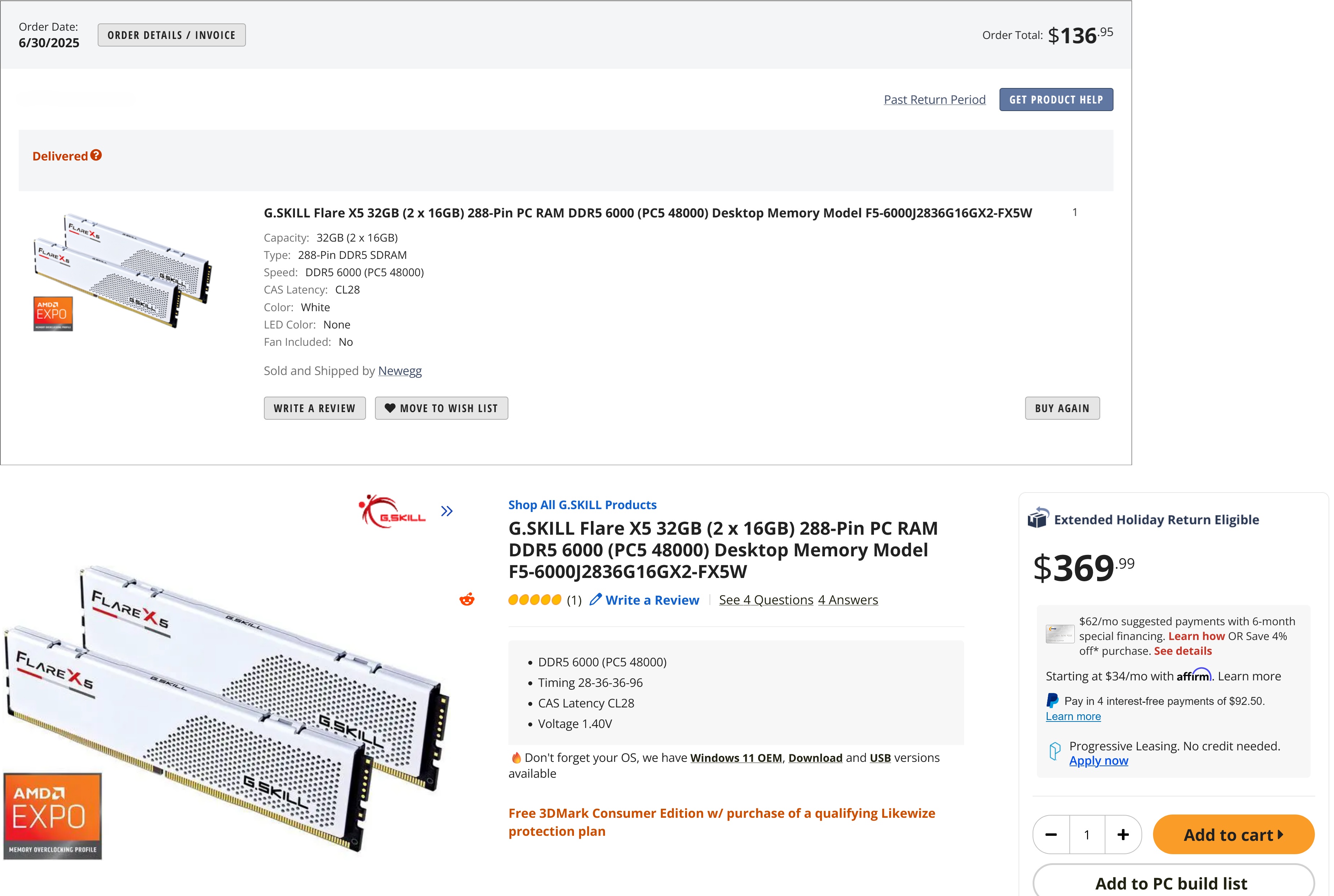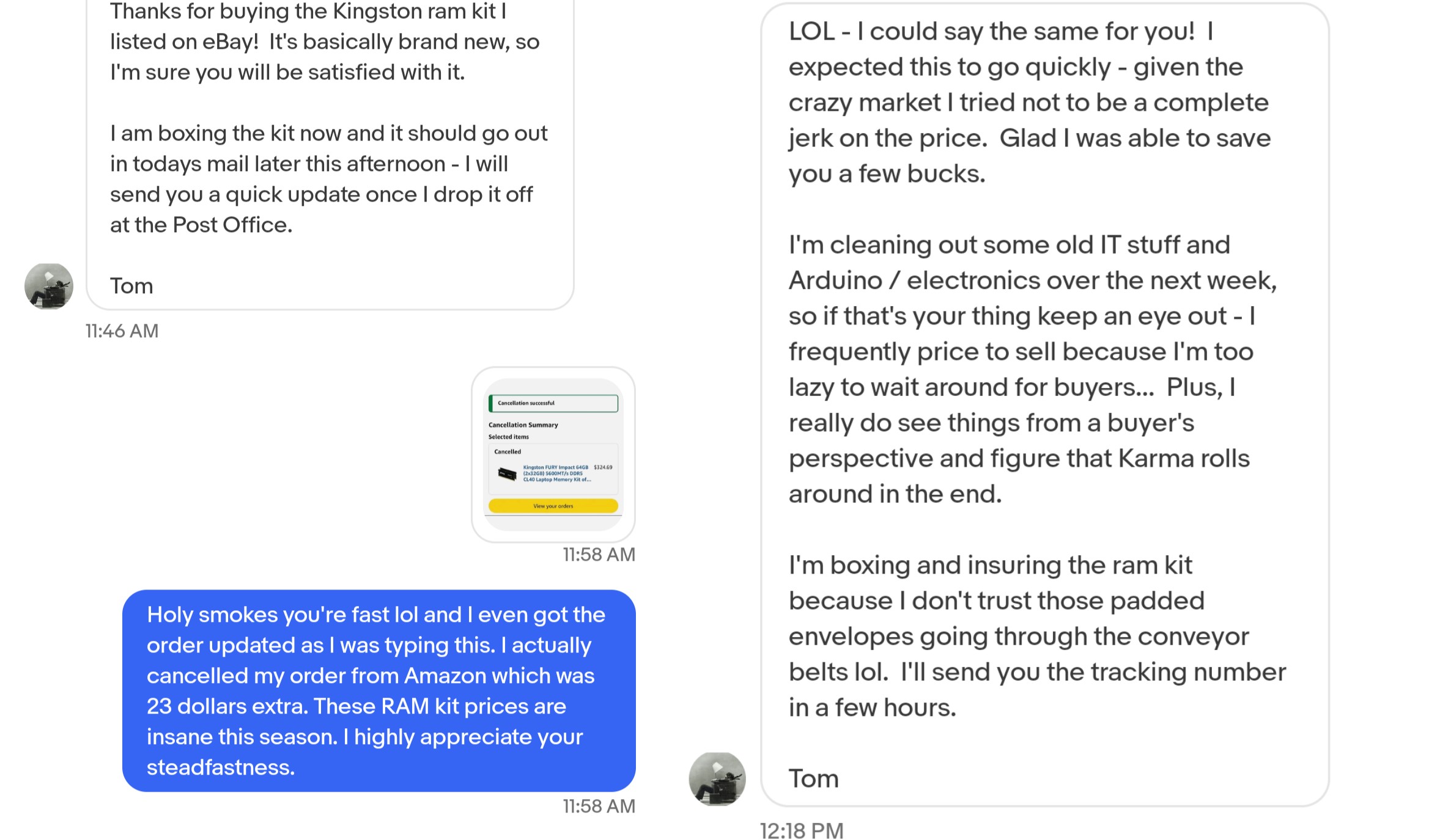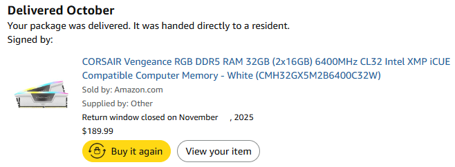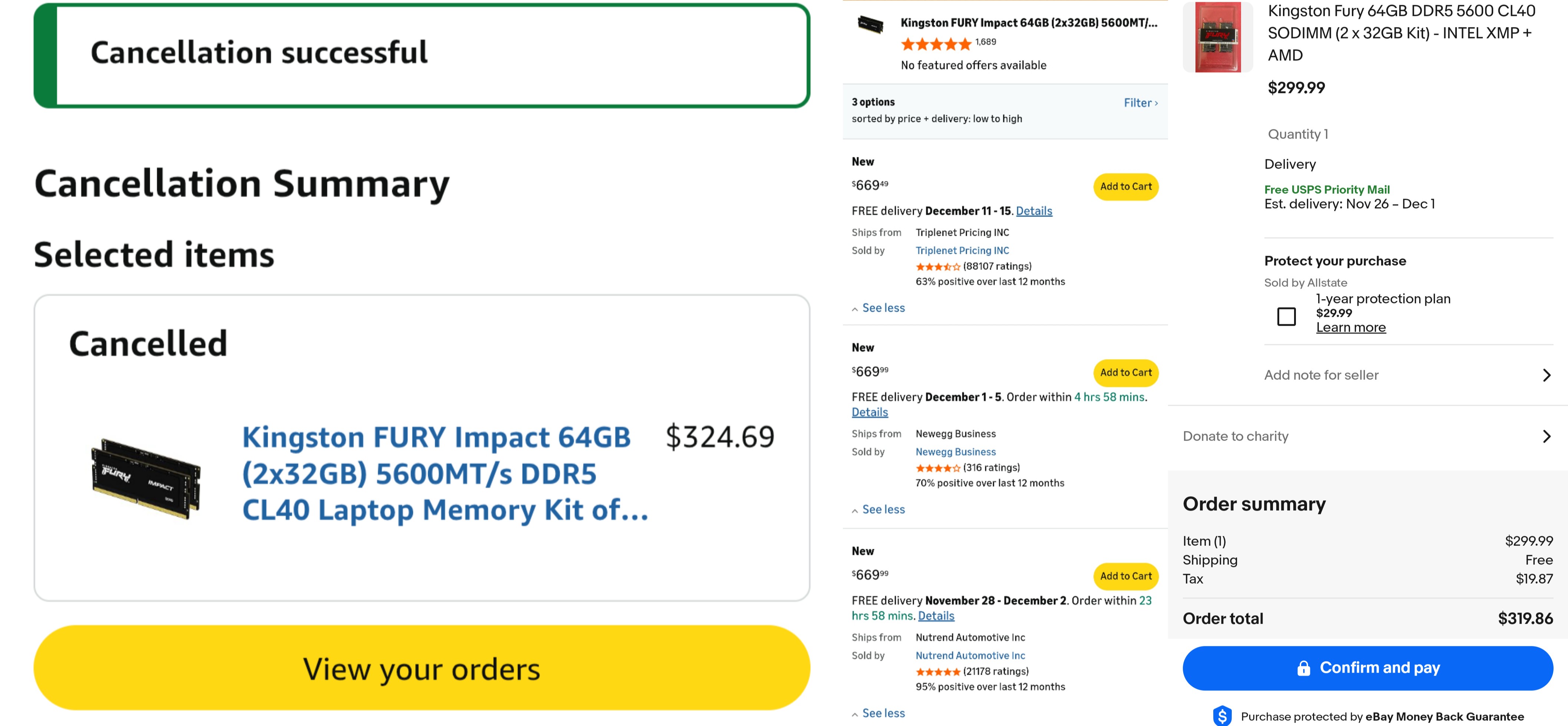 >Bought Kingston Fury 5600 MT CL40 2x32GB RAM Kits for my laptop at a $324 price point on Saturday on Amazon with an estimate delivery date between Dec 2-4>I looked at the same item today which was sold out and the companies there were offering this shit for 2x time the asking price >Today I found the same exact item on eBay from some random seller who was selling it for $299>Quickly cancelled my Amazon order which hasn't shipped yet to buy it from him and I literally got the shipping notification 15 mins after purchase as he sent itI almost got gypped by the market and was saved by fortunate circumstances lol. You're better off buying RAM kits from some courteous eBay seller who won't jack up the prices to shit. Also did I forget to mention my Amazon order would've came later and some of the RAM kits delivery estimates I saw were from Jan-June of next year like wtf is that about.