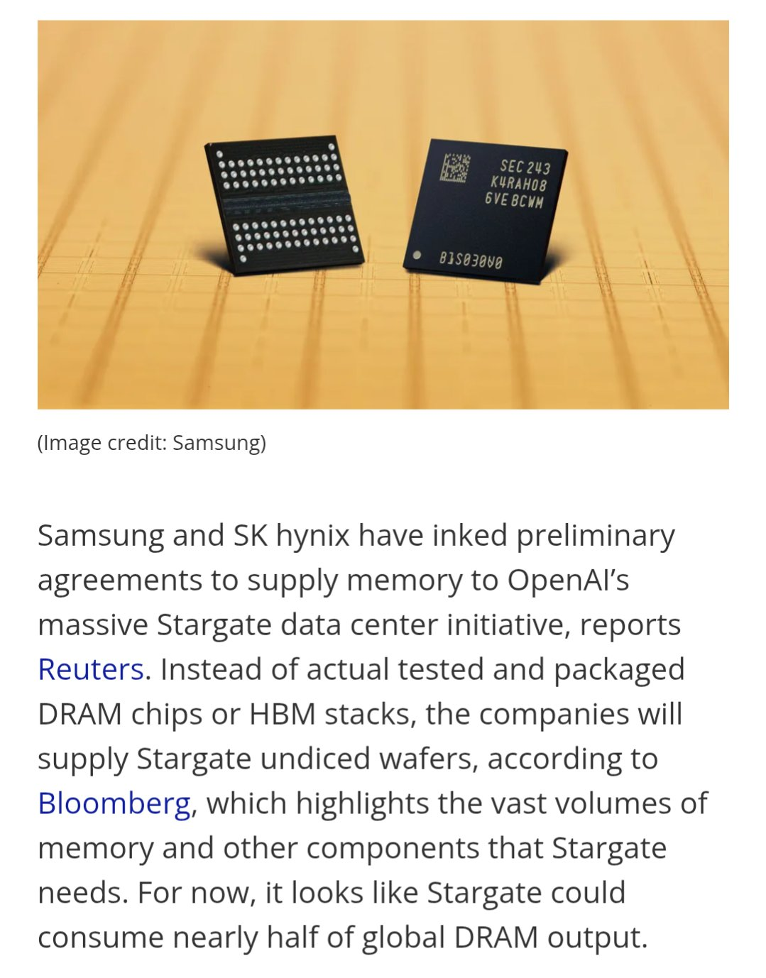>>726694649>OpenAI buys a fuckton of RAM>everyone single other company interested in AI panics as they believe there might be a shortage happening, they also buy a fuckton of RAM en-masse>RAM companies see money signs and dedicate almost all of their production to AI companies since they pay better than the normal consumer>AI companies don't have enough, they start hoarding consumer-grade RAM too>RAM shortage everywhere, which spikes consumer-grade RAM prices through the roof>already forecasted to affect GPU to the point Nvidia might either halt production of the 5000 Series to entirely focus on the 5000 Super line, or delay the Super line and minimize GPU productionCoordinated or not, we're once again at the mercy of billion dollar corporations circlejerking about the brand new fad and making everything worse for everyone. All for shittier search engines that make things up 50% of the time, like Google wasn't shitty enough already. But hey, might as well use some of these AI engines and generate as much hyper degenerate AI porn you can.