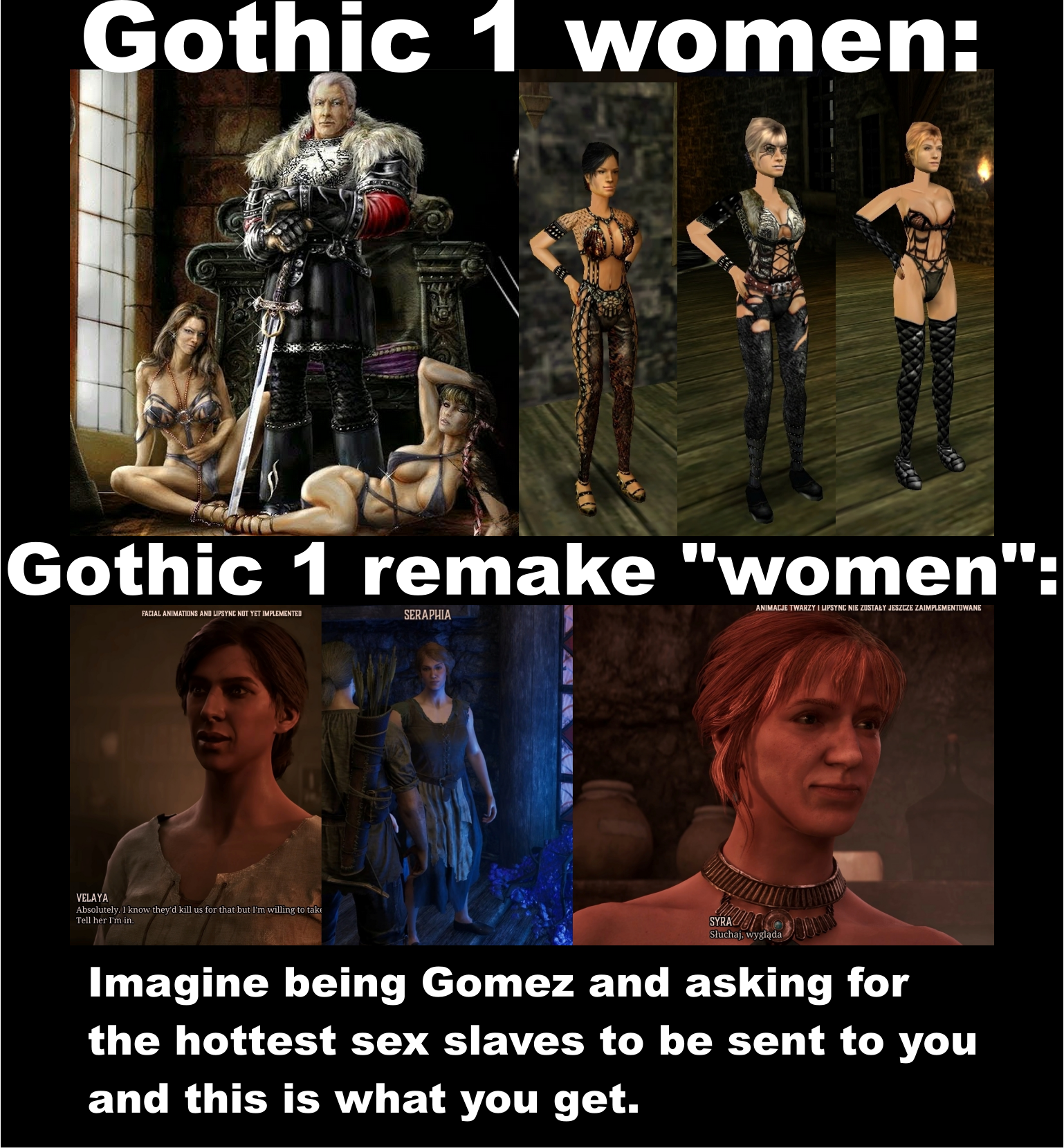 >>726725220Looks aside, outfits in Gothic 1 are just modern fetish wear, doesn't fit the setting, even if stylized. Should actually be more revealing maybe - sheer silk gowns and jewelry. Or just normal clothes, but they undress for their master in private.