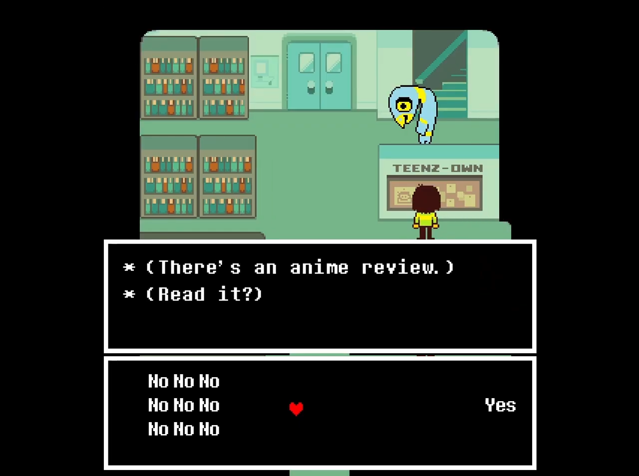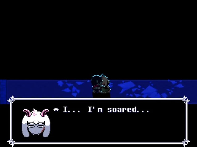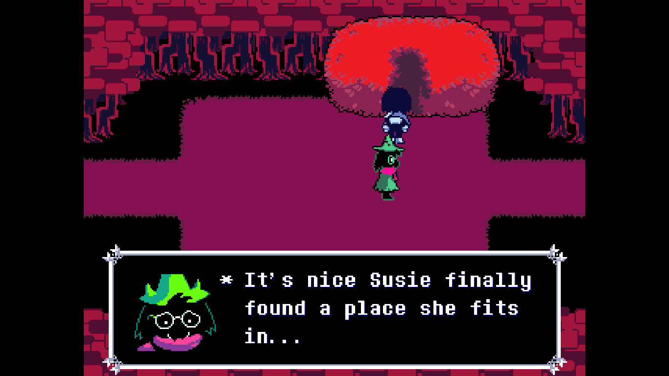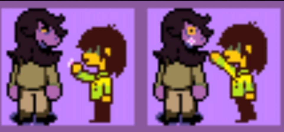 >>727651693>* (Hey, Kris, it's not like someone has to tell you to sit, right!?)Kris has to do what we tell them to but they don't ONLY do what we tell them to. If Kris was a mindless automaton, like our vessel, they wouldn't ever be ripping us out, would they?Kris has plenty of opportunity to act freely and express themself throughout the game, they do shit we don't tell them to all the time. The "I'm Susie's REAL friend" cope is frankly kind of embarrassing, Susie's friendship with Kris is as genuine as it can be under the circumstances.