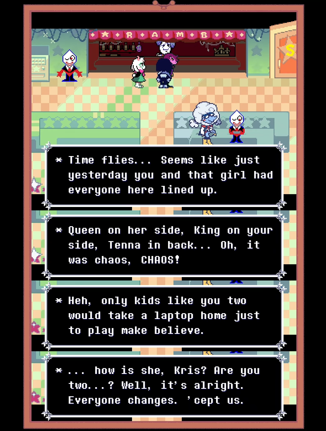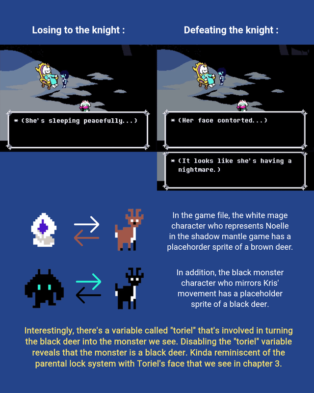 >>727652504It's Dess.>The TV World is all about Kris's past and home life and there is not a single mention of Noelle anywhere. Dess is prominent as a role model and a significant presence in the house, and whatever happened to her clearly had a severe impact on Kris.>"only kids like you two would take a laptop home just to play make believe" implies that Kris and "that girl" were similar. Kris was a cheating thieving little prankster brat, and Dess was a classic teen punk rebel type. What was Noelle like when she was younger? A little scaredy-cat crybaby. Which girl is going to steal a laptop from the public library? Who was having "some REAL fun" with Kris in "the old days"?>This dialog pretty much outright states that King, Queen and Tenna, along with other characters in the Dark Worlds like Jevil and Spamton, were invented by Kris and "that girl" in their make-believe. Makes perfect sense for Tenna's Dark World created by Kris, but the other Dark Worlds were created by The Knight. Why did The Knight choose to make its Dark Worlds there, anyway? And isn't it interesting that the Dark Worlds created by Kris and The Knight seem pretty much, the same while Susie's is very different. What does that tell us?That's pretty much the three pillars that swayed me, but there's smaller points supporting them too>Noelle consistently downplays her friendship with Kris; she's clearly coping but the most we can say is "they hung out with their big siblings" "they got on a ferris wheel once" "Kris played the piano at her house">King/Card Kingdom was where Dess and Asriel were taught by Gerson, they would have had better access to it though it's not inconceivable that younger kids could have played with the stuff in there too, hey why does Asriel have a drawing of Seam on his computer