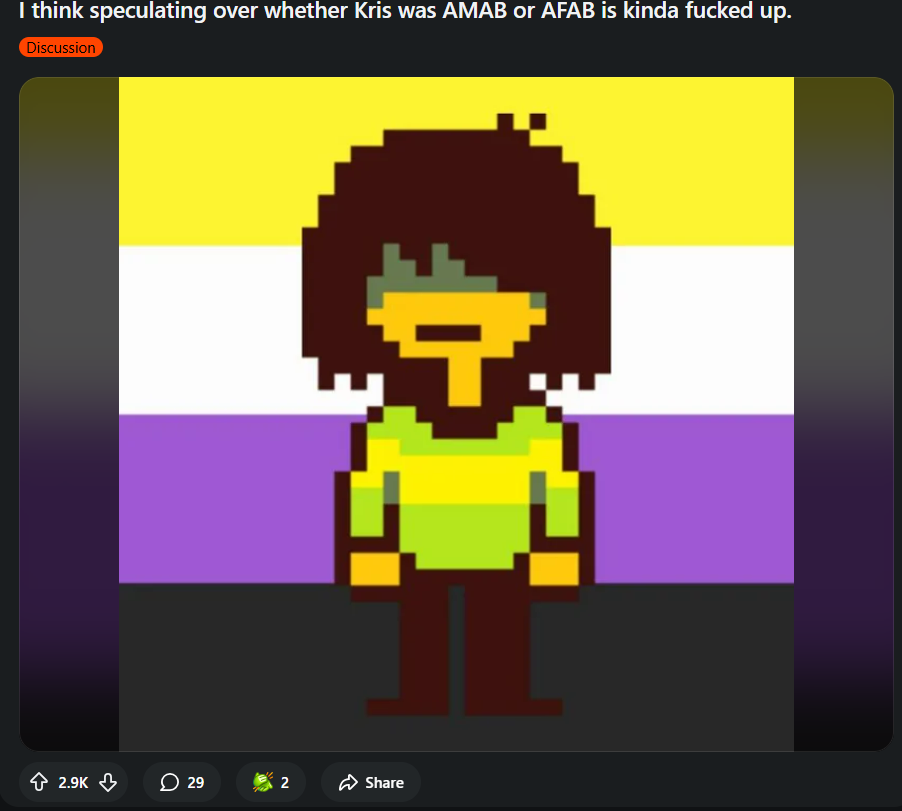 >>727582343I can only see Frisk and Chara as girls but I don't mind FemKris too much.