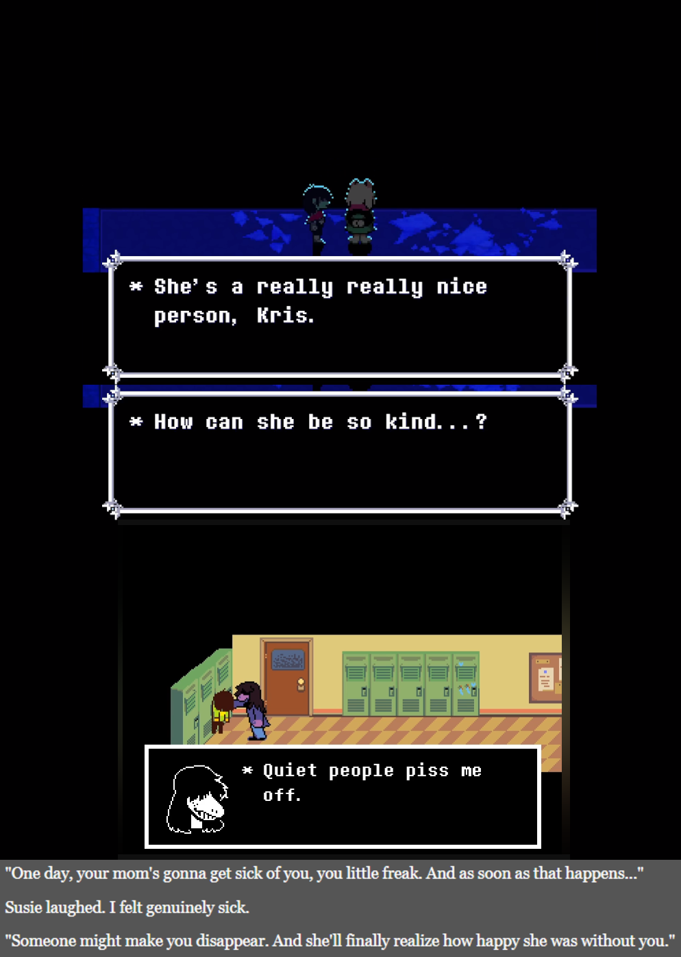 >>727640323Yep that one really fucking sucks, i was hoping Susie to say ''damn she is kinda harsh with Kris'' but nope they continued like nothing happenedShe literally got upset that Monster Kid and his bf were shittalking Kris in the ch2 bunker, why didn't she said anything there lmao, i geniunely can't tell if this will be really important because Kris ghosted Noelle or if it's just Toby and his yuri fetish