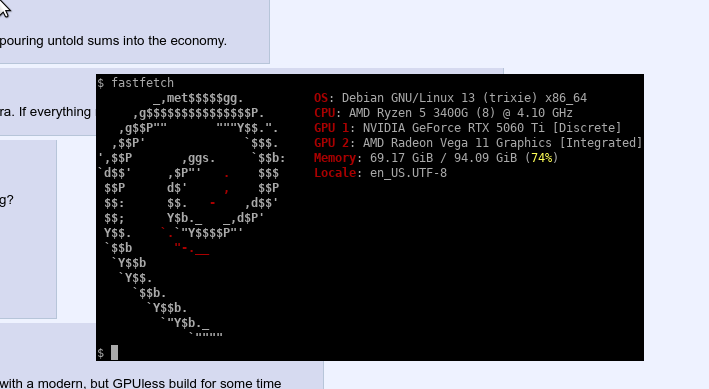 >>727624680I've been thinking of upgrading to 5700G but the 3400G does what it needs to do. I really would prefer having the iGPU.